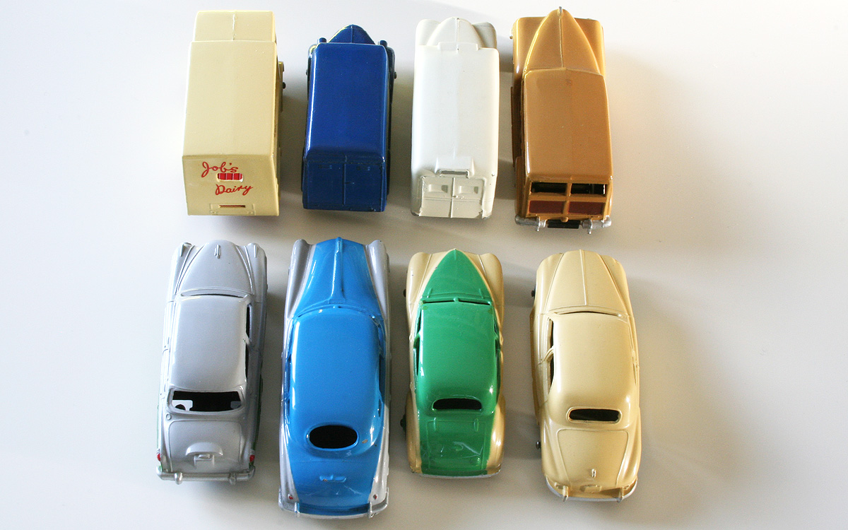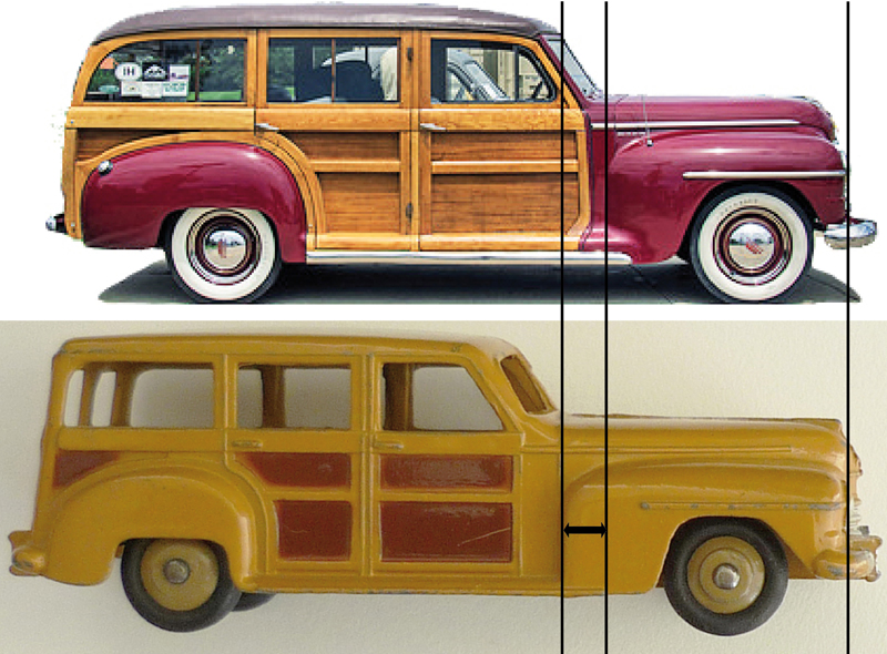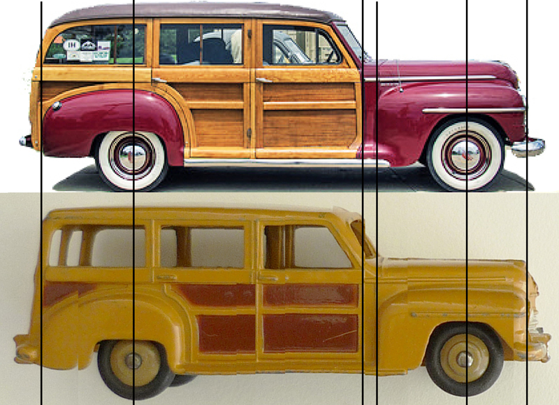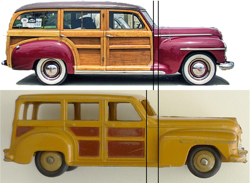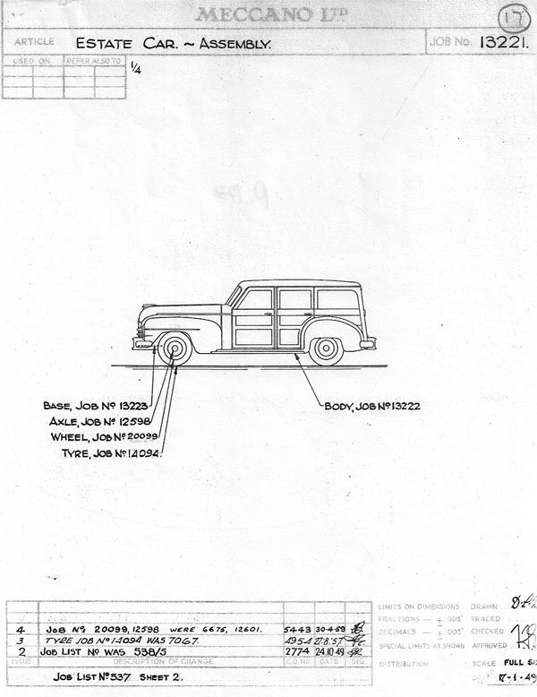Hi Ragnar, I agree with you as the proportions of the models are concerned. These deviations from the real one are a mystery. But I believe I can explain the incorrect, very straight back, as opposed to the flowing one of the real car. I presume that for some shape categories there was an 'ideal' technique of diecasting, and this especially in terms of economy. Any shape can be produced accurately, but with a more complicated, so expensive die. I made a photo showing models with a box-like shape and models with smooth rounded shapes. The box-like types all have the seam of the die halves running over the top of the model from front to rear. Apparently the whole model had to be rather squarish for that, and, if not, had to be manipulated to that shape, in this case, the back included. If the die had to allow for both the many square, straight surfaces AND for more rounded areas, like the Estate Car, it would most probably have become too expensive. So Meccano made its own adapted, straight design for the rear of the Estate Car. Just a little theory ... Kind regards, Jan