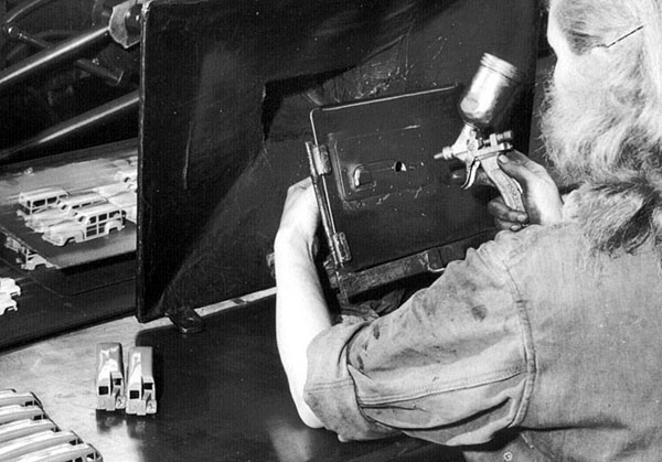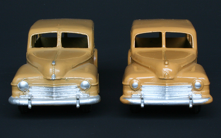 Dinky Toys 27f - 344 comparison silver painting front Jan W TMT Of your left one the front badge and ornament of the decorative strip at the top of the hood are also painted silver and I have not found this on other same models. To my knowledge, front bumpers, grilles and headlights are painted silver, using masks. As far as I can judge, I can hardly believe that these upper ornaments are included in the mask spraying, because I dont see this in the series of same models. I think that these are hand painted, but not in the factory.