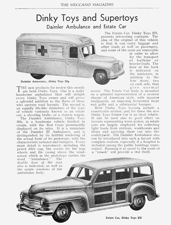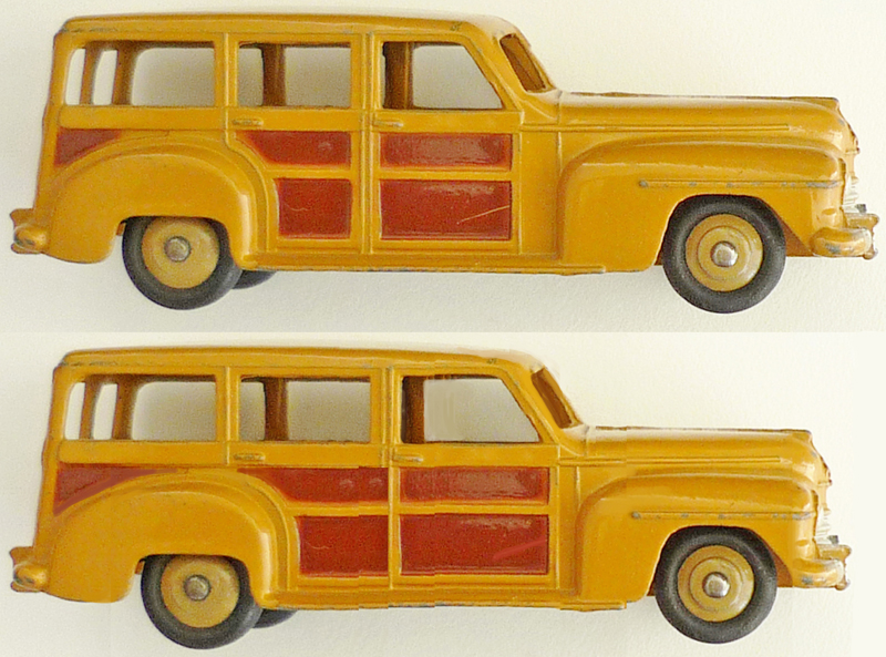 A very nice review of this popular Dinky......it was also an early favorite of mine. Many American car manufacturers made similar, wood bodied estate cars (station wagons here in the US), up until the early 1950's, and these are now very collectible today and command high prices. Dinky made a very nice model of the Plymouth wagon, although the rear roof area slopes down on the real car. It certainly appeared in a lot of early catalog covers and ads.Best regards, Terry