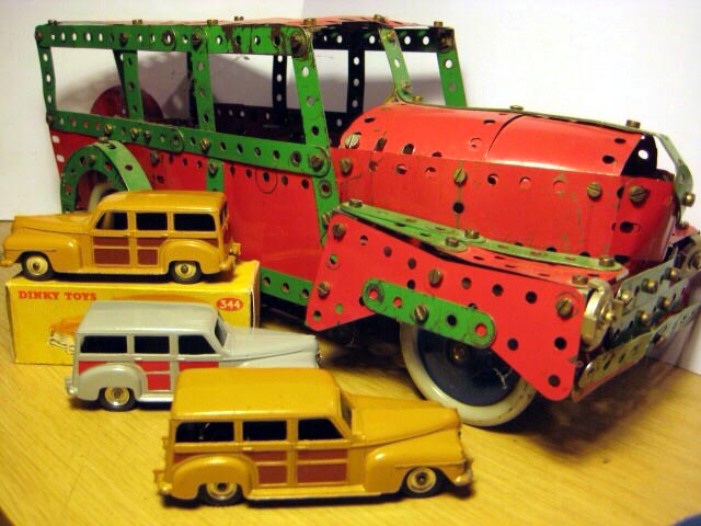 I think overall I am more a fan of the spun wheel, probably because they were introduced about the time I was entrusted to buy my own Dinkys with pocket money rather than get them as presents. I lusted after the cadillac 131, but even shop soiled without a box couldn't afford one (settling for a similar condition Capstan van instead - probably worth more now!).As former Sec of the Woodie Car Club, I attach a photo of my Plymouth Estate cars. The Meccano one is built to contemporary Meccano plans but unlike the Dinky has the embellishment of a rear mounted spare.