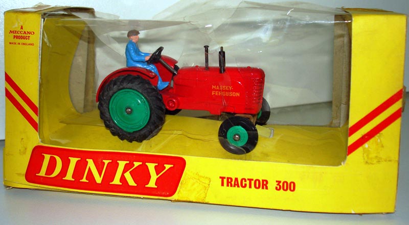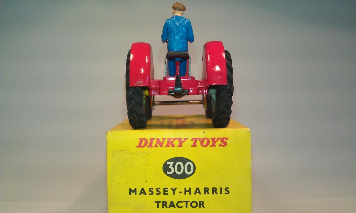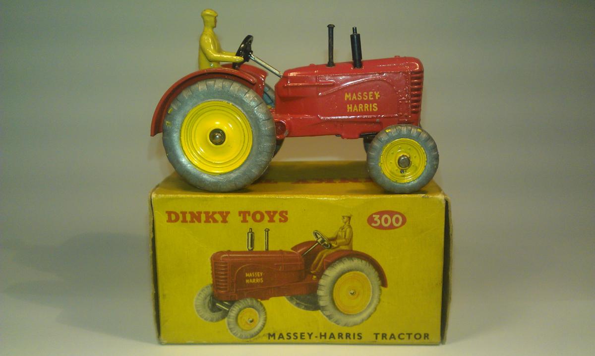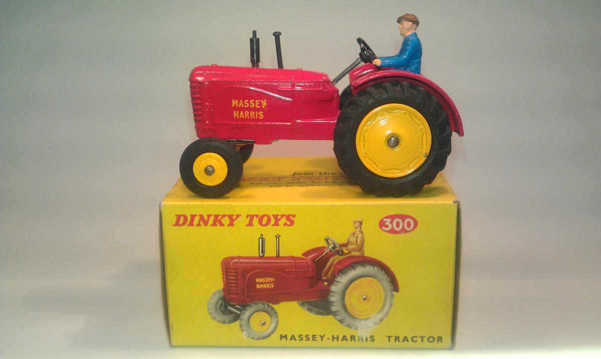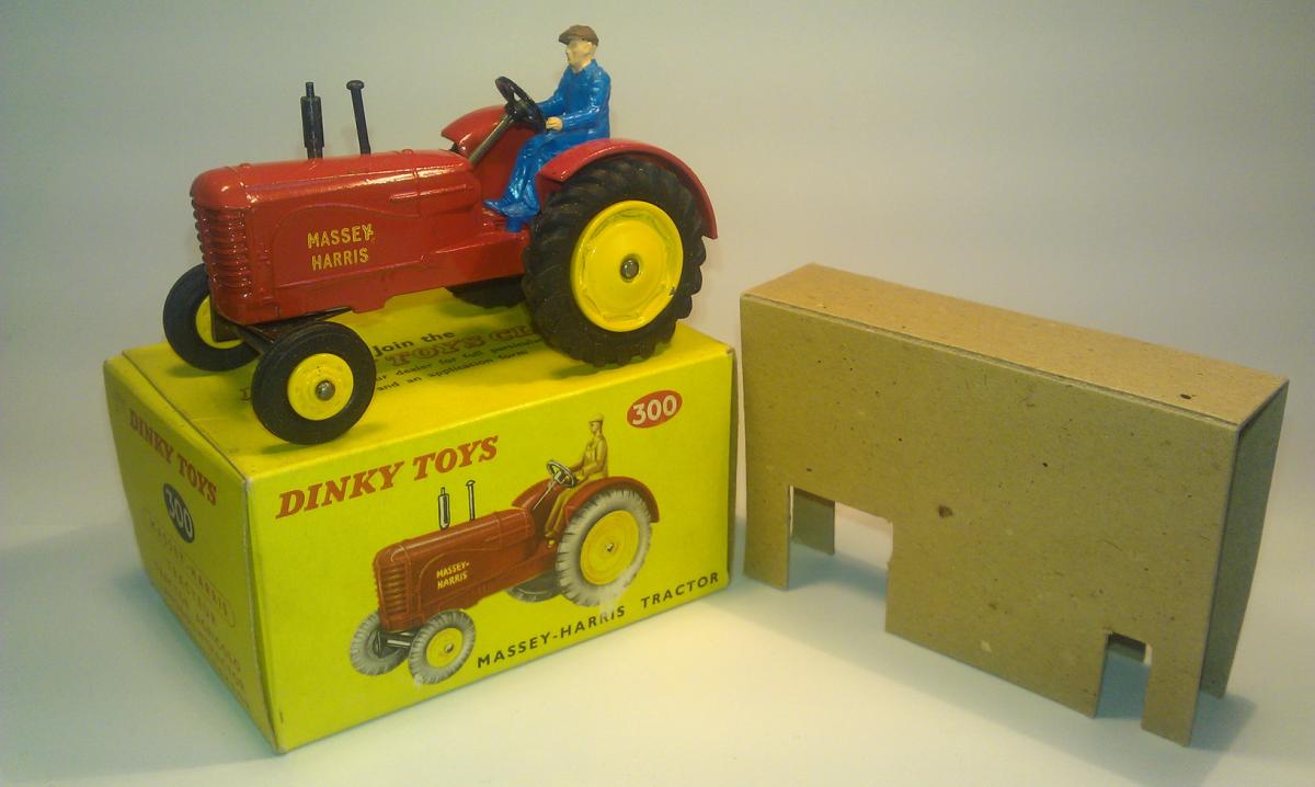 I found an amusing story about the Massey-Harris Farm Tractor, the model, the real one and their boxes(!): DINKY TRACTORS GO FULL SIZE David Cousins Wednesday 3 June 2009 To mark the 75th anniversary of Dinky Toys, North Yorkshire tractor enthusiasts have created the ultimate homage full-size replicas of two of their models, complete with display boxes. They go on public display for the first time at Newby Halls tractor rally on Saturday 6 and Sunday 7 June 2009. Peter Dean of Galphay, near Ripon, created a display box for his 1950 Massey Harris 744 tractor, a full-size version of the Dinky toy version, right down to the colour of the packaging. The size of a single domestic garage, the display box is made of wood and painted in the same style as the original Dinky version, owned by fellow enthusiast and the man behind the idea Maurice Craven. People will think were mad for trying to do this, but with 2009 being the 75th anniversary of Dinky Toys, there has never been a better time to recreate the Dinky model at actual size, says Maurice. Really, we have just done the reverse of what Dinky are famous for; they take a full-size vehicle, miniaturise it and put it in a box. Weve taken a miniature box, increased its scale and put it around a working vintage tractor. It took several weekends for Peter a joiner by trade and his son, Mark Dean, to build the boxes and paint them in the Dinky style. The second model is an orange Field-Marshall Model Series IIIa, dating from 1953 . Kind regards, Jan