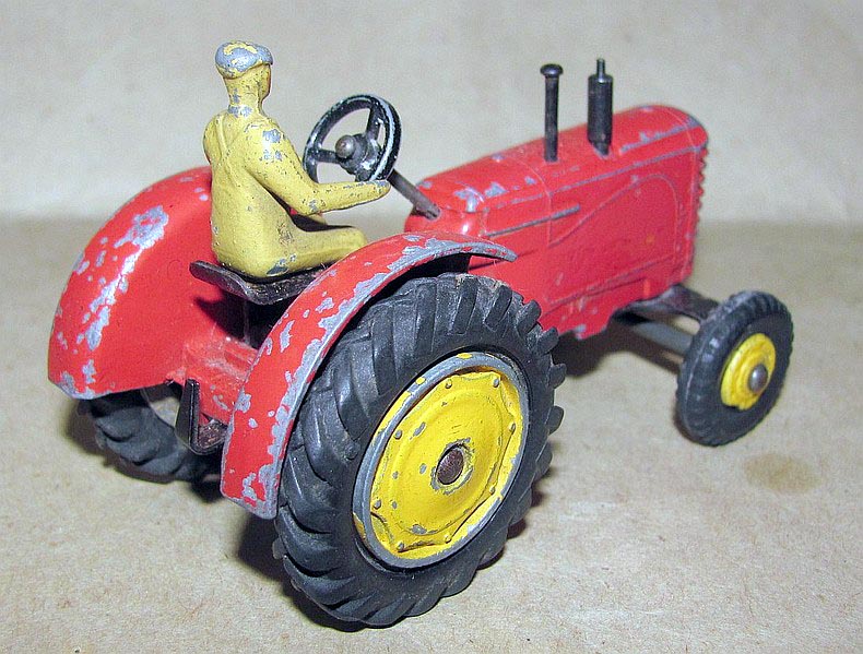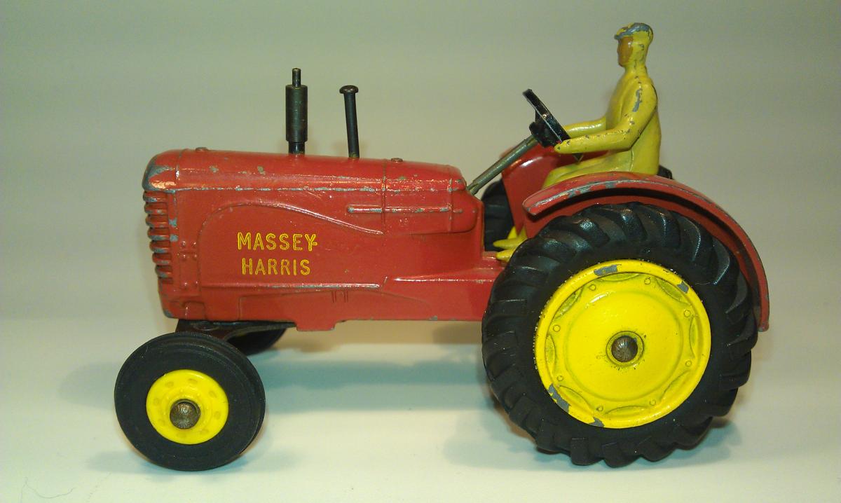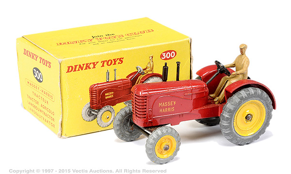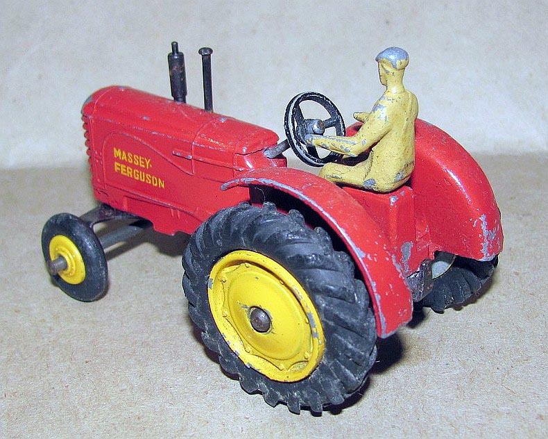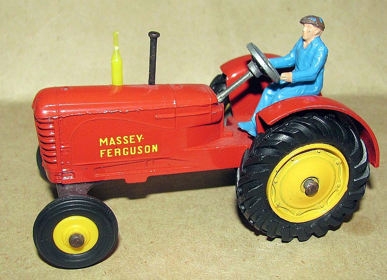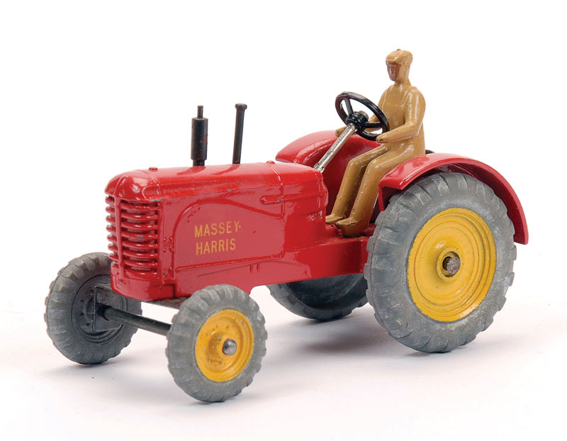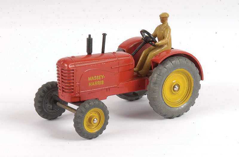 I found an amusing story about the Massey-Harris Farm Tractor, the model, the real one and their boxes(!): DINKY TRACTORS GO FULL SIZE David Cousins Wednesday 3 June 2009 To mark the 75th anniversary of Dinky Toys, North Yorkshire tractor enthusiasts have created the ultimate homage full-size replicas of two of their models, complete with display boxes. They go on public display for the first time at Newby Halls tractor rally on Saturday 6 and Sunday 7 June 2009. Peter Dean of Galphay, near Ripon, created a display box for his 1950 Massey Harris 744 tractor, a full-size version of the Dinky toy version, right down to the colour of the packaging. The size of a single domestic garage, the display box is made of wood and painted in the same style as the original Dinky version, owned by fellow enthusiast and the man behind the idea Maurice Craven. People will think were mad for trying to do this, but with 2009 being the 75th anniversary of Dinky Toys, there has never been a better time to recreate the Dinky model at actual size, says Maurice. Really, we have just done the reverse of what Dinky are famous for; they take a full-size vehicle, miniaturise it and put it in a box. Weve taken a miniature box, increased its scale and put it around a working vintage tractor. It took several weekends for Peter a joiner by trade and his son, Mark Dean, to build the boxes and paint them in the Dinky style. The second model is an orange Field-Marshall Model Series IIIa, dating from 1953 . Kind regards, Jan