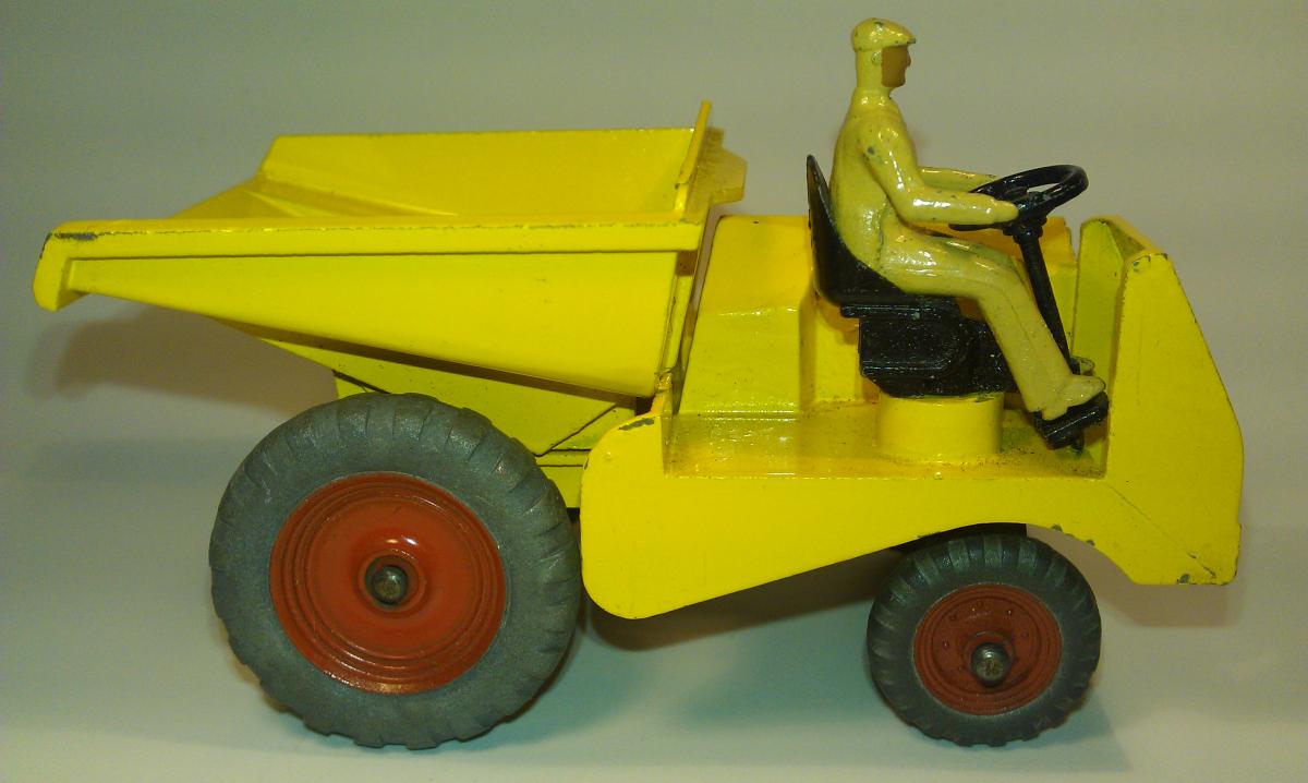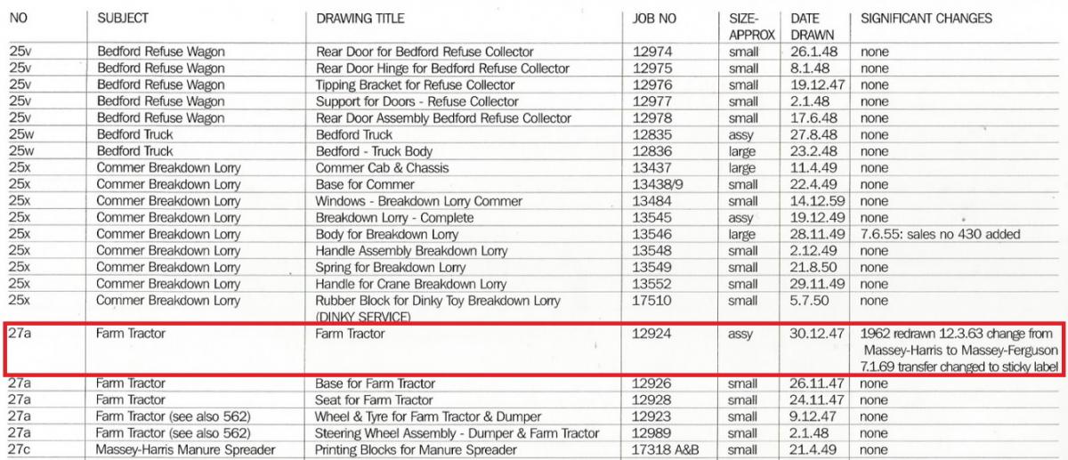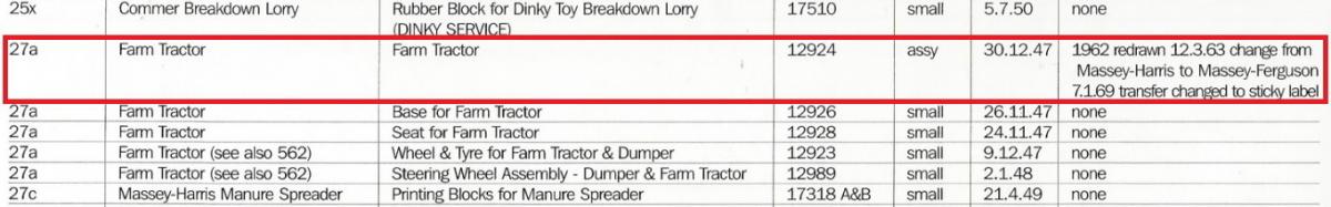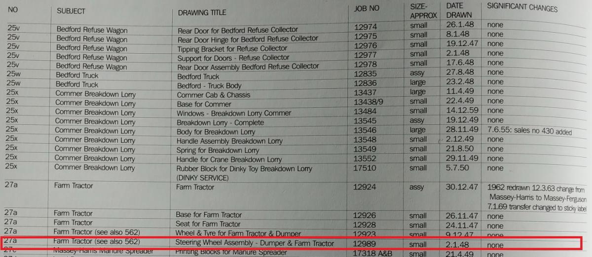 Dinky Toys Massey Harris Tractor - right - early version with black steering wheel on black rod; left - later version with black steering wheel on blanc rod In the meantime I searched and found an answer at my question in my contribution above, about my thoughts about the colour of the steering wheel rod of the earliest MH tractor. I found confirmation of my findings in the job list in the GBDT page 178 (see picture): The steering-wheel assembly of the Dumper truck and Farm tractor are equal (2-1-1948). Although the steering rod is not mentioned in this, I assume that the steering rod is an essential part of the steering wheel and included in the assembly of the steering wheel. The steering wheel and the steering rod of the 562 Dumper Truck are completely black (see picture). Thats why the earliest version of the 27a Massey Harris Tractor the steering wheel and the steering rod, according Job No 12989, are also completely black.