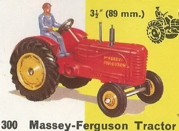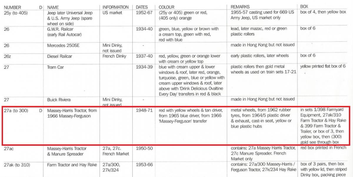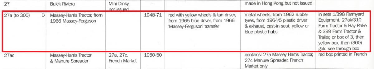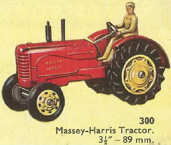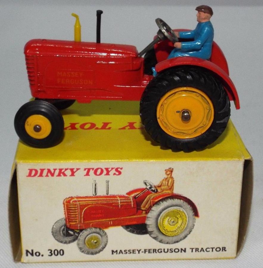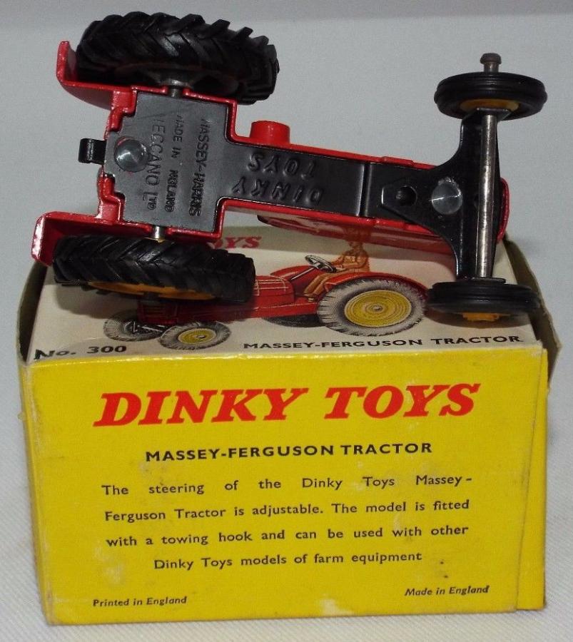 Dear Jan Thank you for the information in your post above, I was not aware of the variation in the driver's bottom. Which is the earliest one ? Split stud or spun / riveted ? There is still a lot to find out about these tractors as there are many variations and a list of the at least twelve different variations has still to be written.The 27a and the 300 are different models. The 27a is stamped MASSEY HARRIS and the 300 is stamped MASSEY FERGUSON. Are there any 27a with tubber tyres ? Some of the 300 had no MASSEY FERGUSON stamping. Factory errors ? There were many boxes, mainly trade boxes for the 27a, at least six different ones and I know only one yellow box with the double numbering. I do not know of a yellow box with only 27a. I think that none has been made because thre was a double numbered trade box. The 300 issued in 1954 had at least seven different boxes all with the reference 300. The double reference yellow boxes were for the 27a. Every one is welcomed to give a complete description of the models in their collection so that a list of the variations can be made. Below is my list of variations for the 300. 1 Diecast hubs and tyres, diecast driver painted beige, tin plate driver's seat, black steering wheel, blanc steering column, spun exhaust, marked Massey Harris by tampoo. 2 Yellow plastic front hubs, rubber tyres, diecast driver painted beige, tin plate driver's seatt, black steering wheel, blanc steering column, spun exhaust, marked Massey Harris by tampoo. 3 Yellow plastic front hubs, rubber tyres, blue plastic driver, tin plate driver's seatt, black steering wheel, blanc steering column, spun exhaust, marked Massey Harris by tampoo. 4 Yellow plastic front hubs, rubber tyres, blue plastic driver, diecast driver's seatt, black steering wheel, blanc steering column, spun exhaust, marked Massey Harris by tampoo. 5 Yellow plastic front hubs, rubber tyres, blue plastic driver , diecast driver's seatt, black steering wheel, blanc steering column, spun exhaust, marked Massey Ferguson by tampoo. 6 Green hubs, rubber tyres, blue plastic driver , diecast driver's seat, spun or yellow plastic exhaust, marked Massey Ferguson by tampoo. Rare issue. 7 Yellow plastic front hubs, rubber tyres, blue plastic driver , diecast driver's seatt, black steering wheel, blanc steering column, yellow exhaust, marked Massey Ferguson by tampoo. 8 Yellow plastic front hubs, rubber tyres, blue plastic driver , diecast driver's seat, yellow exhaust, unpainted steering wheel and steering column, marked Massey Ferguson by tampoo. 9 Yellow plastic front hubs, rubber tyres, blue plastic driver , diecast driver's seat, yellow exhaust, black steering wheel, unpainted steering column, with or without Diesel Harris marking by tampoo, special South African yellow box. Rare South African issue.