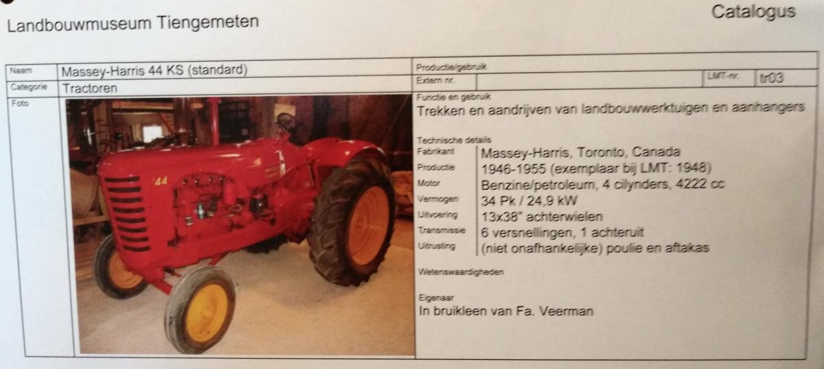 Museum catalogue card Massey Harris 44 with description in Dutch. This tractor is equipped with a benzine / petroleum engine. The engine must first be started on gasoline (benzine) and when the engine is warm, must be switched to petroleum - (The English translation gives me problems). - Petroleum was cheaper than benzine. I will show you pictures of this real Massey Harris 44 from 1948 and the latest produced real Massey Ferguson 8740S from 2018. The Massey Harris brand name changed to Massey Ferguson in 1958 and is the most widely sold brand of agricultural machinery in the world. Kind Regards, Jan Oldenhuis, 10 September 2018