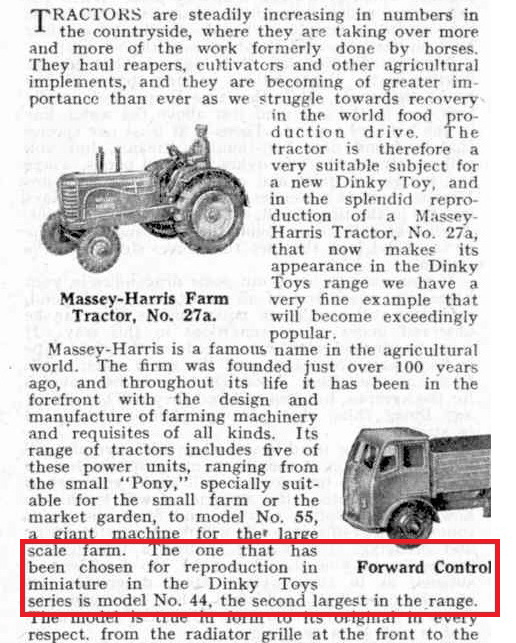 Meccano Magazine June 1948 about the reproduction of Dinky Toys 27a Massey Harris tractor Below I show the catalogue card of the museum with the description of the Tractor in Dutch