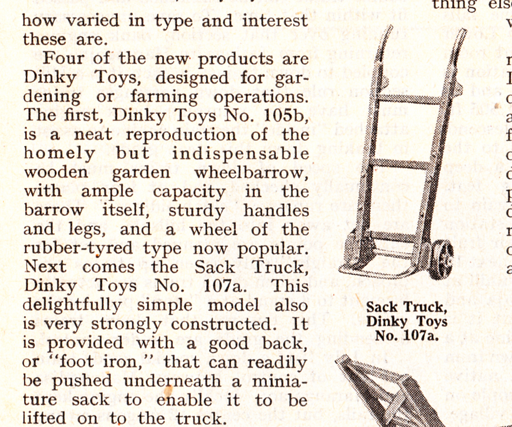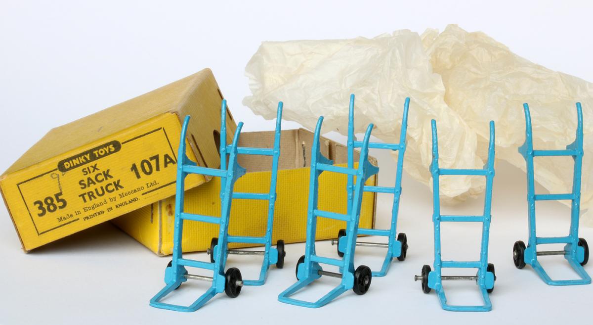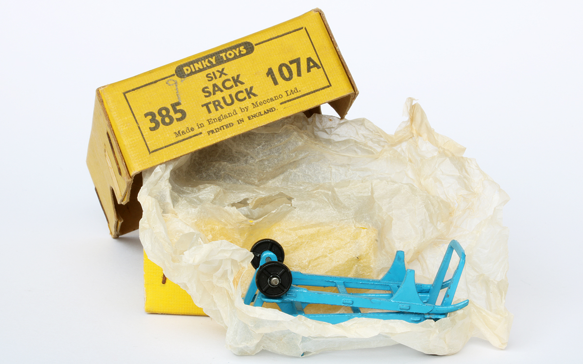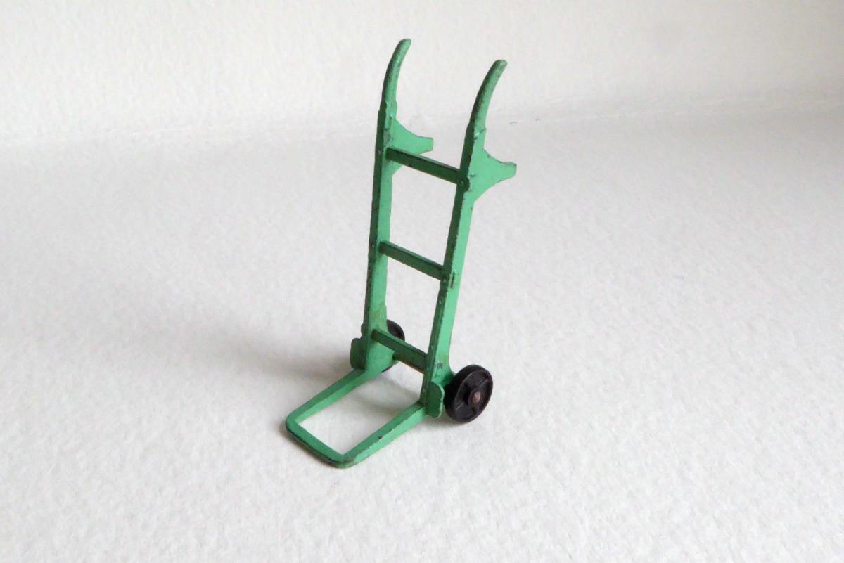 If you did not even have the money to buy a Matchbox model, then it might be just enough to buy this Sack Truck, one of the cheapest Dinky Toys, chaaper than a Matchbox toy indeed. It was introduced in Meccano Magazine of July 1949, in the range of smaller farm vehicles. It is a one piece casting, provided with two tiny all zamak wheels, which it shared with the no. 27b Harvest Trailer and the much younger no. 190 Caravan. As an exception this one was not numbered in the 105 numbers, but as a lonely 107 series number. In the end they all came together in the new 380's numbers. It was never sold in an individual box but from trade boxes of six. They were packed in pairs, wrapped in thin tissue paper. The older numbered trade boxes may also contain the scarcer green version. The blue one is very common. It was pictured in colour (blue) only once, in the 1953 catalogues. Before that they were only shown in black and white and later catalogues made a textual reference only. The only reference cast in is the name Dinky Toys, on the back of two horizontal bars. If anyone can show a nice picture of the green one, with or without trade box, please do! Kind regards, Jan