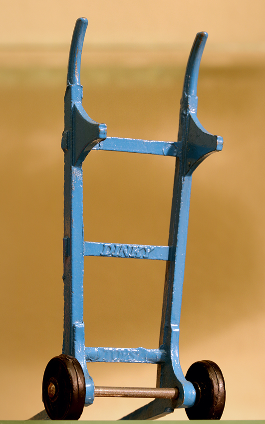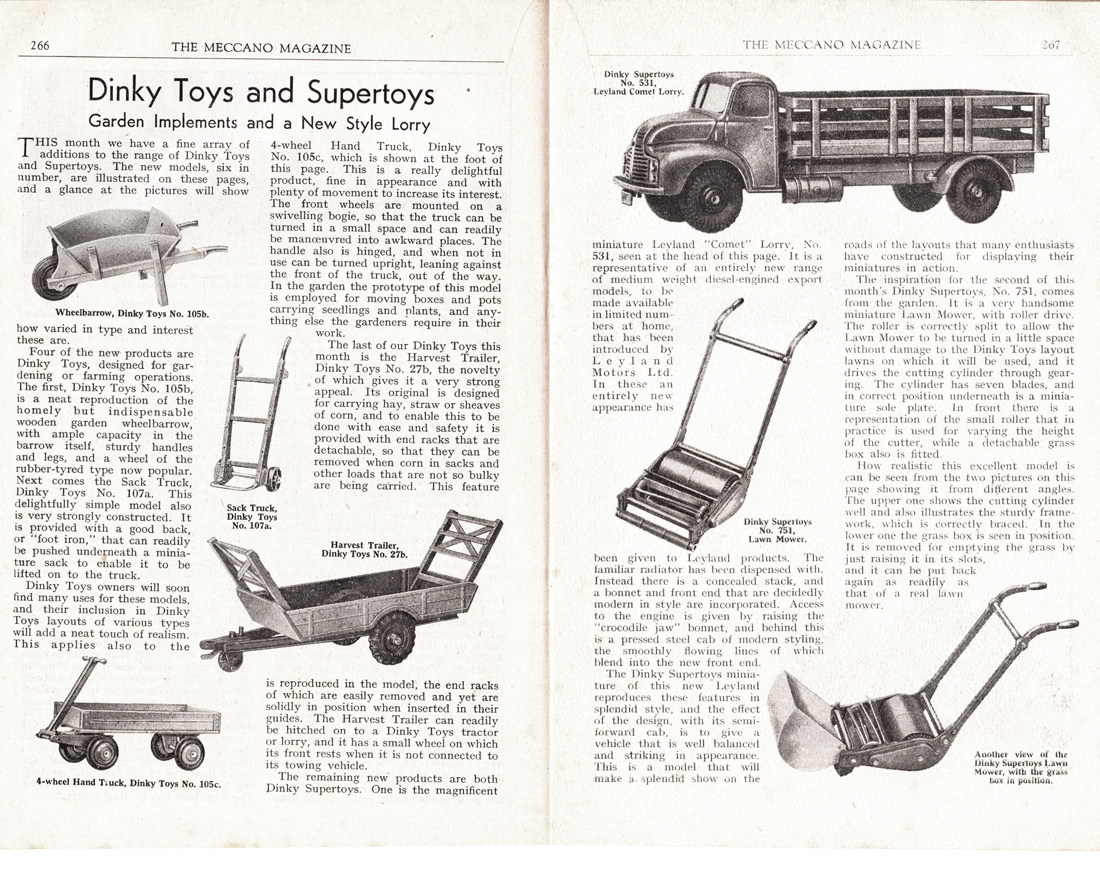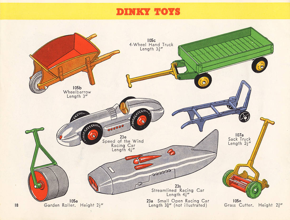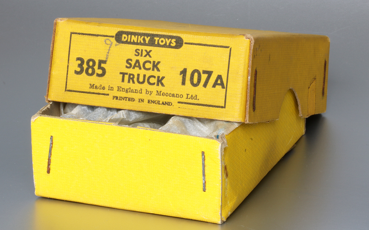 If you did not even have the money to buy a Matchbox model, then it might be just enough to buy this Sack Truck, one of the cheapest Dinky Toys, chaaper than a Matchbox toy indeed. It was introduced in Meccano Magazine of July 1949, in the range of smaller farm vehicles. It is a one piece casting, provided with two tiny all zamak wheels, which it shared with the no. 27b Harvest Trailer and the much younger no. 190 Caravan. As an exception this one was not numbered in the 105 numbers, but as a lonely 107 series number. In the end they all came together in the new 380's numbers. It was never sold in an individual box but from trade boxes of six. They were packed in pairs, wrapped in thin tissue paper. The older numbered trade boxes may also contain the scarcer green version. The blue one is very common. It was pictured in colour (blue) only once, in the 1953 catalogues. Before that they were only shown in black and white and later catalogues made a textual reference only. The only reference cast in is the name Dinky Toys, on the back of two horizontal bars. If anyone can show a nice picture of the green one, with or without trade box, please do! Kind regards, Jan