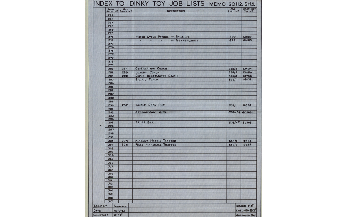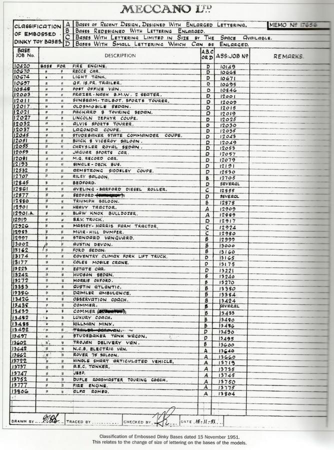 Jan, amazing. What a wonderful additional information. Very valuable if you can collect this kind of information through auction catalogues. I do not follow auctions like that, but it does produce very valuable information. I focus more on DT catalogues.I hoped for a readable drawing of the Field-Marshall and that has now been added by you. Many thanks for that.I hoped to be able to see changes to the Driver Job No 12907 from cast to plastic driver. But I do not see that. I see mentioned Wheel Job No 60001 + 60686 and Tyre job No 60687 + 60689 (14-11 ?? - 61), not clearly readable, that probably refers to the change from metal wheels to plastic hubs and rubber tires. Axle Job 12945 was Job 12946 at 28 -8-5 ?? (date also difficult to read). If it was 28-8-53, it was before introduction in October 1953. I do not see directly difference in axles between my version 1 and 2. I must confess that I am a beginner in reading and explaining this kind of drawings.The index to Dinky Toy Job Lists is also very special. Very valuable information. I count 53 consecutive numbers on sheet 6 x 19 sheets = a total of 1007 consecutive numbers which could filled in with a new model. Funny to see number 272 Motor Cycle Patrol - Netherlands is the ANWB Motor Cycle Patrol which was introduced in 1959 and deleted in 1962. All very valuable information and nice to have. It also shows that the process of renumbering was accurately administered. It is a pity that the list does not show the date of the renumbering per sales number. That would help me to more accurately reflect the renumbering process.Do you know if Meccano Liverpool for the Dinky Toys also made separate Paint Job Lists for the colours that have to applied to the models? That would make it easier to determine existing colour variations or combinations in the models.Kind regards, Jan O.
