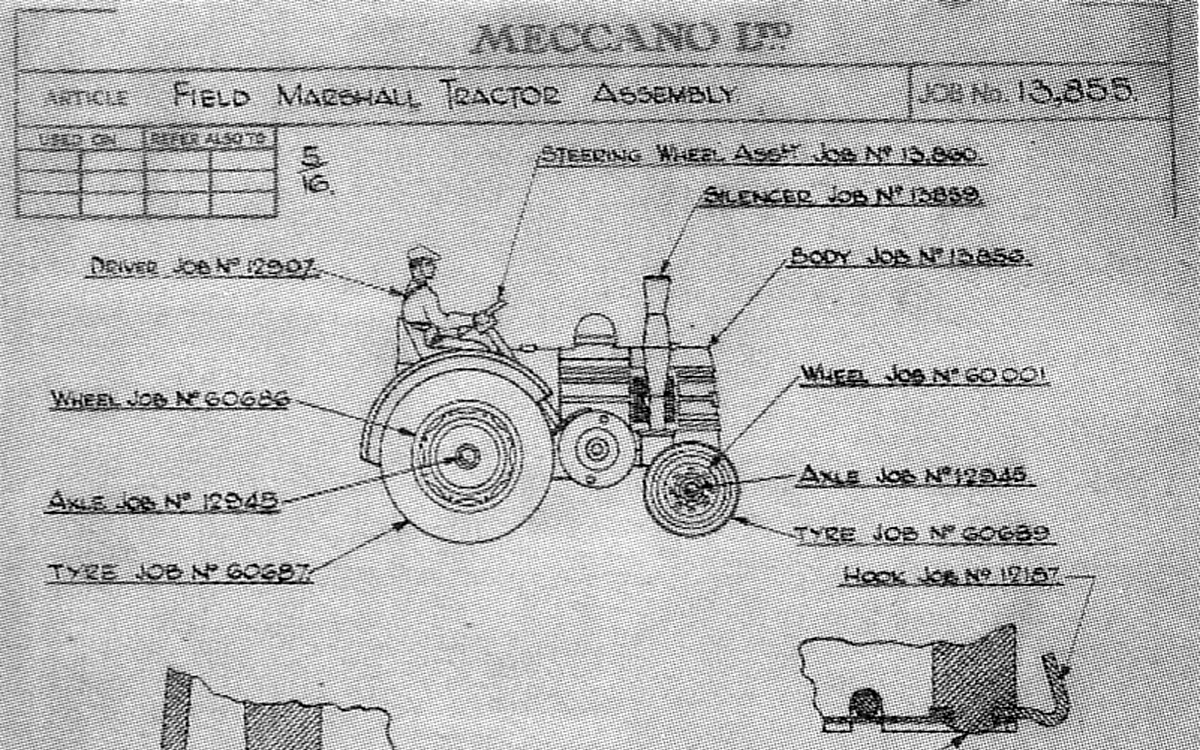 I have 2 versions of this tractor about which I searched some information. In my search I came across some interesting details about this model and his base plate in the process of renumbering. This aroused my interest in the process of renumbering and went to investigate when this process in practice started and ended, which result I also show in my contribution. The Field-Marshall tractor was introduced in October 1953 in Meccano Magazine with sales number 27n.