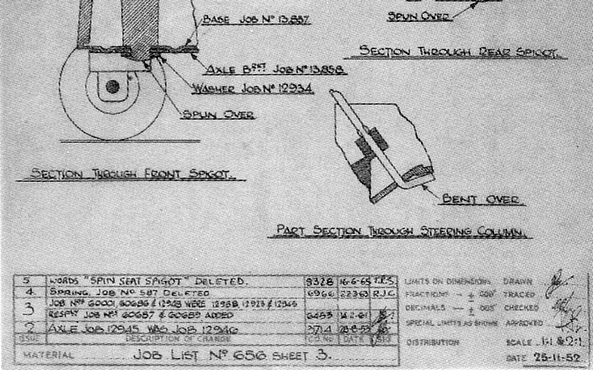 Jan O, An interesting thread. The drawing which is for the variation with tyres mentions : 'words 'spin seat spigots' deleted' and date 16 06 65 certainly relates to the change from metal to platic driver. Job No 12907 is the plastic driver. I have not yet found the job N for the metal driver. 60 001 is for front plastic hub 60 686 is for rear plastic hub 'Job 60 687 & 30 389 added' relates to the change of metal to rubber tyres. Sorry, I can not read the date, probably 14 2 61.