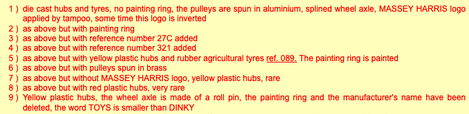 This is the version 6 with spun brass pulleys and split pin wheel axleThere may be an explanation why Meccano deleted the tampoo (not transfer) marking MASSEY HARRIS and did not change it to MASSEY FERGUSON. The word FERGUSON is longer by two letters and would not have fitted in the small area of the right hand side. The cost of a new tampoo was not important, the main cost was to apply the tampoo to the model. Why was the splined rear axle changed is an other question. I am looking for a icture of the last version with the red plastic hubs. Can anyone help ?