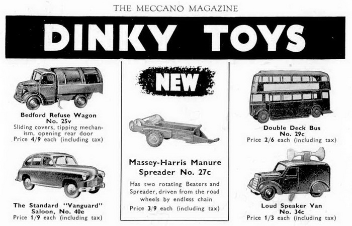 Massey-Harris manure spreader is a part of the post-war 27 series farm equipment. Here together pictured in catalogue UK 1957. Massey-Harris: Canada's most important tractors producer was Massey-Harris. It was founded in 1847 in Newcastle, Ontario Canada. Massey-Harris was founded by Daniel Massey as the 'Newcastle Foundry and Machine Manufactory'. In 1891 the 'Newcastle Foundry and Machine Manufactory' merged with A. Harris, Son & Co. Ltd. to Massey-Harris Co. After a few unsuccessful attempts in the field of tractors, production did not really begin until 1928, with the acquisition of a tractors factory. The first articulated tractor was already innovative and the Twin Power tractors of 1938 continue that progressive trend. After the war, the 44 K (=Dinky Toys 27a 300=) became Massey Harris's bestseller.