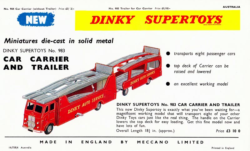 800 483 If I thought the 990 Gift Set was expensive in Australia at 2/10/6 just look at the price of the 983 Car Carrier and Trailer without any cars! A whopping 3/10/-!! In the UK, it was priced at a mere 1/18/6!! Kind regards Bruce (150)20160305/823/0247