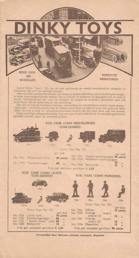 My first contribution failed me as a reply. This is my 'copy' of the Dutch Dinky Toys FO leaflet of June 1937 with the Dutch words 'Meer dan 250 modellen'. On the DTCA website you can find the original. On the cover you see the Tank Units. Unfortunately, mine is a copy of a toy shop OTOOS in Arnhem from around the 1970's, given by this shop as a promotional leaflet for the customers. I bought this 'copy' for little money on Ebay. Vectis, probably not knowing that this was a copy, sold this copy on 15 December 2004 Lot 3721 for GBP 200. They could easy recognize it as a copy through the contemporary modern phone number. A very expensive copy !!! So there you have it again: 'Always something new from Dinky Toys'. Kind regards, Jan