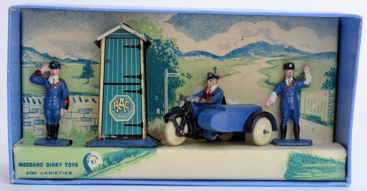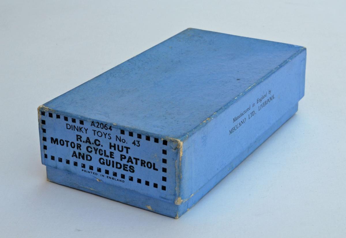 The #43 R.A.C. set was introduced in Meccano Magazine in October, 1935. Like the Police Set, it consists of a hut, a motorcycle, and two uniformed men or guides. The main difference is, the hut is not diecase like the Police set, but of tinplate, and somewhat smaller, probably explaining why it was the least expensive of the three. I happen to like the colors of uniforms that the guides are wearing.....light blue, with hand painted accents. Anolther interesting fact is that all three boxes are slightly different in size, with this one the smallest. Best regards, Terry