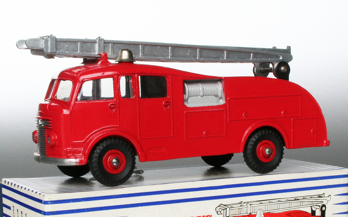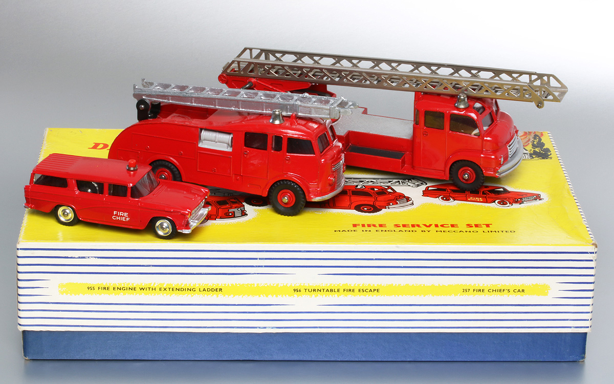 For the more wealthy children, this gift set came available at the end of 1959, and it was included in the catalogues until 1964. Patrick Trench mentions 1966 as the end date in his Compendium - but that concerns the image of this trio and does not refer to the no. 957 gift set packaging anymore. Indeed, the individual models, the no. 257 Fire Chiefs Car, no. 955 Fire Engine with Extending Ladder and no. 956 Turntable Fire Escape remained for sale a few more years afterwards. Meccano Magazine of December 1959 presents a beautiful colour image on the occasion of the introduction of this gift set, on the second last page. The characteristiscs of the content changed with the evolution of the individual models. From the beginning they all had plastic windows, although they seem to be fitted without them on the box illustration (which may date from slightly before their introduction). At the end of the gift sets availability, both the Fire Engine and the Turntable Fire Escape were fitted with plastic hubs. The wheels of the Fire Chief's Car have never been painted red and diecast, as pretended by the same illustration. The white tyres also seem to be hardly ever or never been seen in this set. Individuals examples show white tyres every now and then, but those are in the minority. The three fire brigade models are nicely packed in the box, embedded in the recesses of a yellow cardboard insert on the bottom. The box is really complete only, if a yellow piece of cardboard on top, with recesses, covers and holds the models in place. The yellow top of the lid and the blue stripes along its sides emphasize in colour the mix of both Dinky Toys (Fire Chief's Car) and Dinky Supertoys (the other couple) that form the combined content of the set. This combination is also heterogeneous in terms of reality. In real life, a Canadian fire chief's car will most probably not often have been sighted in the company of a so typical duo like the British Commer and the same Bedford fire fighter vehicles.