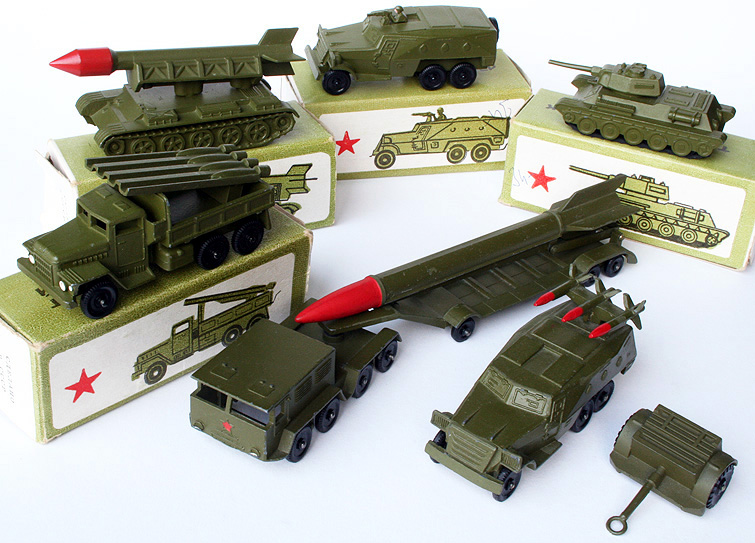 As you can see they are like two peas in a pod, the Dinky on the left the other one on the right. Now its not so haphazard, because every now and then Im looking for some new additions for the items of my 'War Technology' Series, which were made in the USSR in the 1970s and 1980s. And this is one of them. War Technology is the name M.C. Barres Baker translated from the original Russian brand name of the range, of which some models are shown below. In fact, an extensive seven page article was written by him, as published in Model Collector 6:1 of November 1992 (pp. 13-19). So if you want to know more about them, I refer to that fine article. The scale of the models is between 1:60 and 1:87, so the models have an average size somewhere between the Dinkies and Matchbox models.