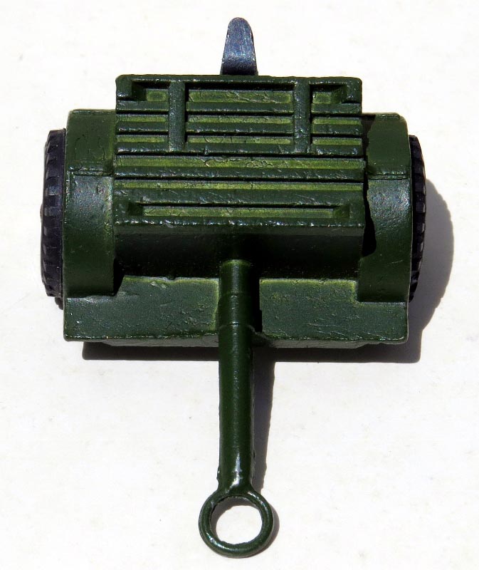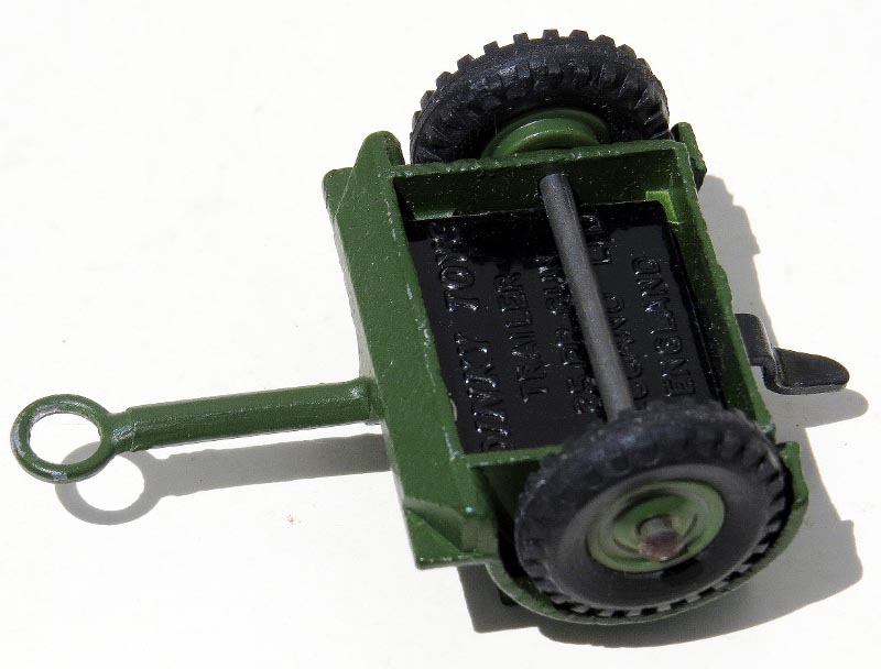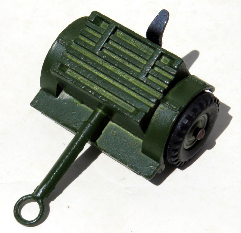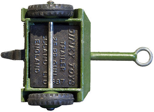 Yes Bruce, this is correct but one must add the casting difference above and so far we do not know if the change of base plate position occured at the same time as changing the angles. This could increase the number of variations. The early drawings on the July 1957 M.M. shows the trailer with the cut angles meaning that the right angles were not cut but added. This is confirmed by the fact that the die could not be modified in the other way. As the 686 25 Pdr. gun and the 688 tractor have been fitted with plastic hubs, the limber should also be found with plastic hubs. Once more we need the description of as many trailers as possible to know how many variations there are. All trailers seem to have treaded tyres. The description must include : with or without ref. number base plate position above or below the wheel axle. Above means between the axle and the casting with or without right angle corners ridged or plastic hubs My only trailer is : no ref number base plate above axle no right angles plastic hubs The manufacturer of the actual trailer was Metro Cammel of Birgmingham (