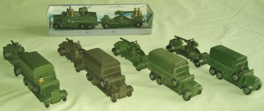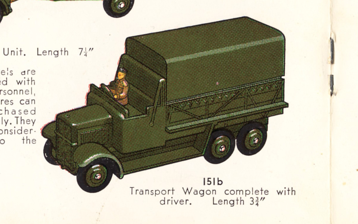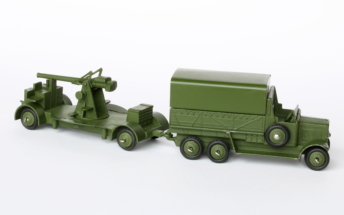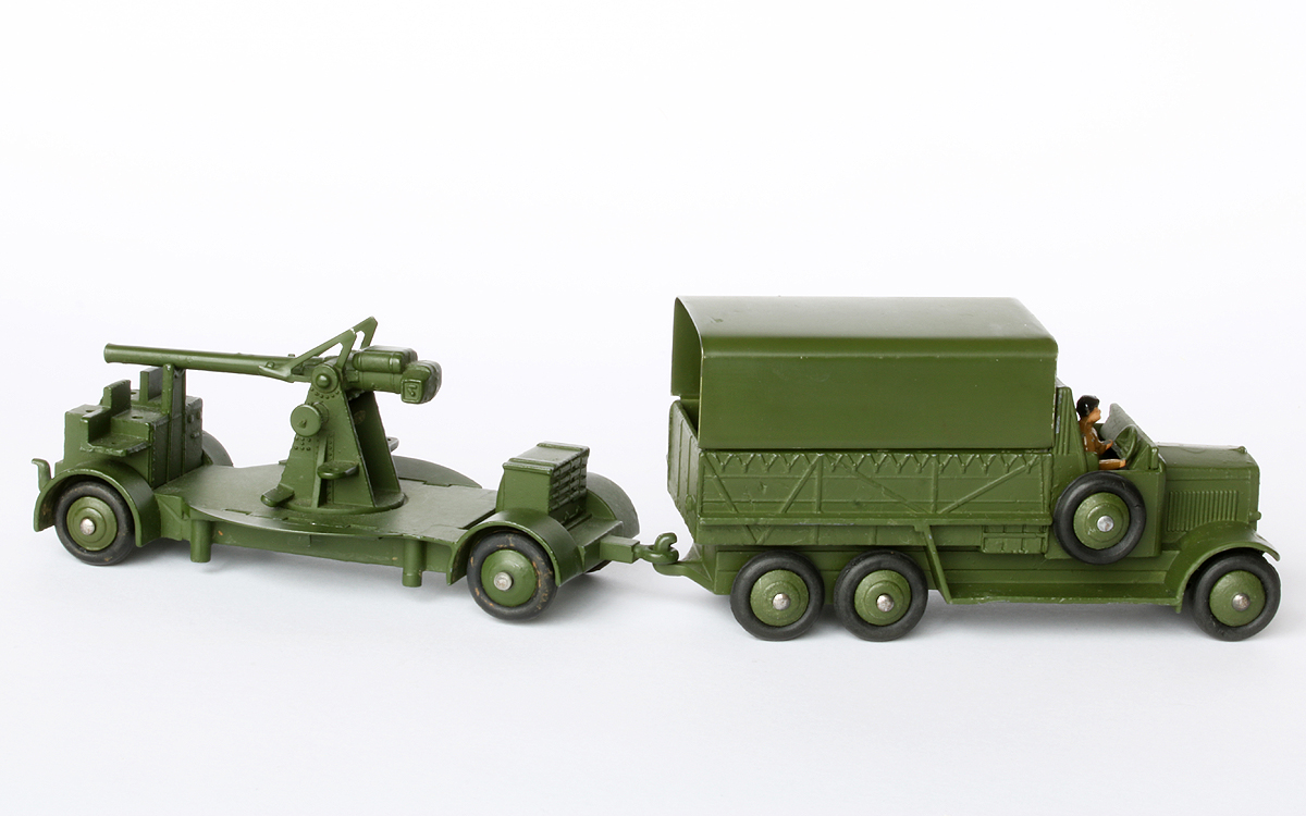 Three perfect matches for various Anti-Aircraft Guns on Trailer: 1. With no. 161a Searchlight Lorry in pre-war Gift Set no. 161 Mobile Anti-Aircraft Unit. 2. With early post-war no. 151b Transport Wagon, both with ridged hubs, crimped axle ends and treaded tyres, each manually marked underneath with the probable date of first acquisition: 2.11.48. 3. With final USA export no. 151b/620 Transport Wagon, with fixed driver, both with ridged hubs, post 1952 domed axle ends and smooth tyres.
