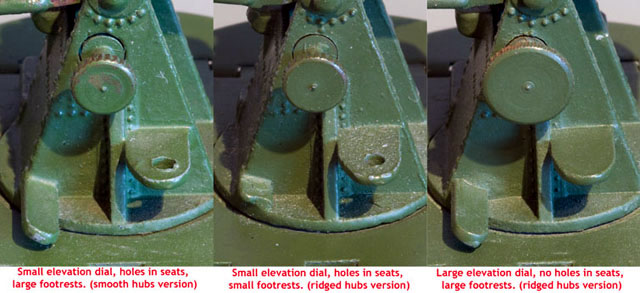 These variations are easier to see on the three close-ups above.The small elevator knob is 5.5mm dia. and the large elevator knob is 8mm in diameter.These are all post war versions as they have the larger diameter axles.No 1 being the earliest, No 2 being later and No 3 being the latest.Are these the only known variations on the post-war 161b AA Guns?Peter can you please consolidate these two entries as I can't put more than 1 photo on a posting. Thanks very much Dave