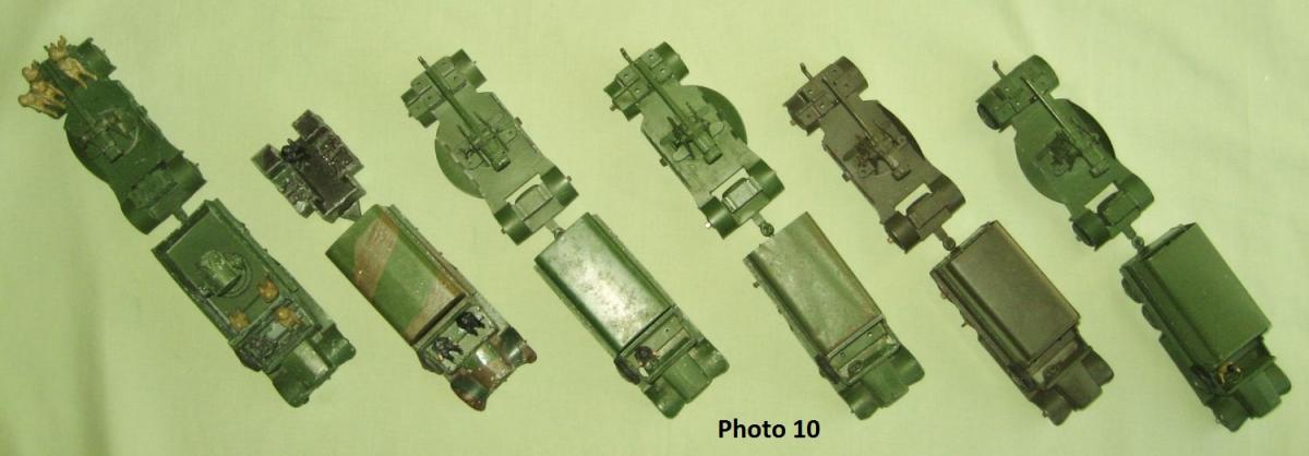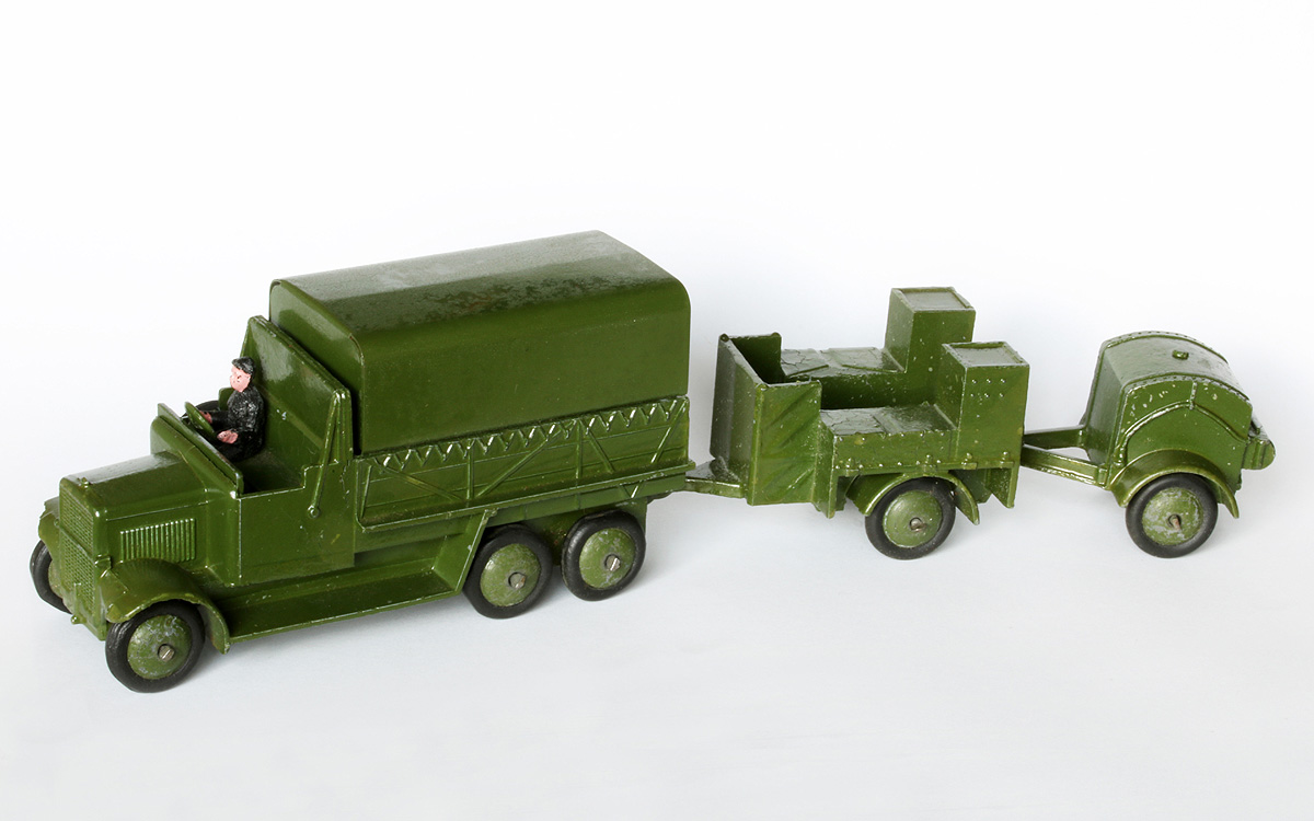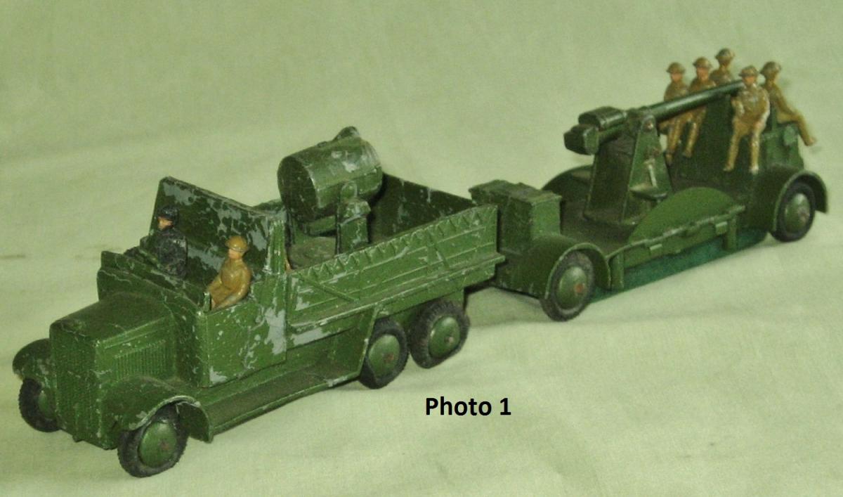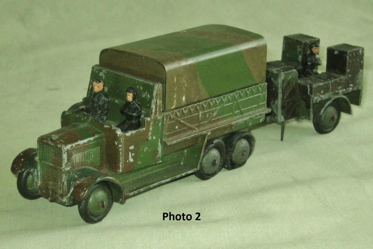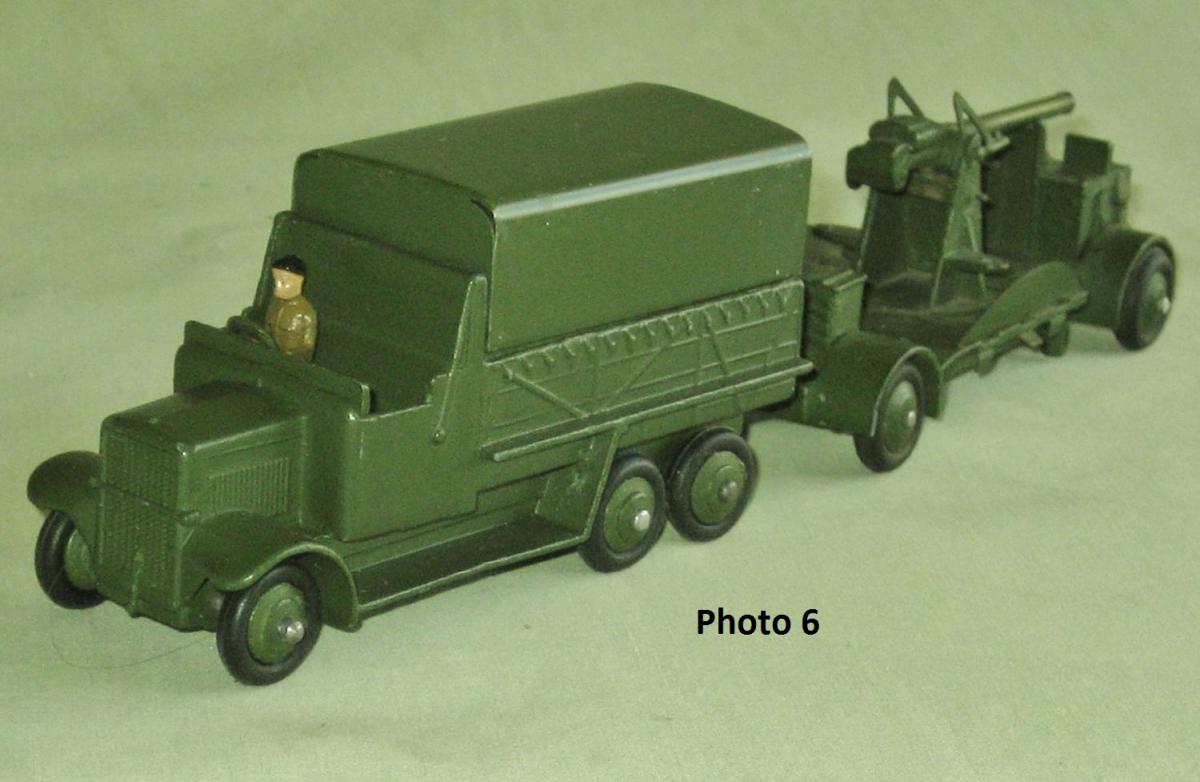 Here is my collection of 151b 6-wheel Covered Wagons. I have coupled them with the equivalent 161b Anti-Aircraft Gun on Trailer, except for the camouflaged version which is with a camouflaged 151c Cooker Trailer. PHOTO 1 - This is actually the 161 Mobile Anti-Aircraft Unit. The lorry has the searchlight in the back and a tin-plate seat across the front of the tray. It has domed wheels and fine ribbed tyres. PHOTO 2 - The rare camouflaged version which was only issued at Christmas, 1940, as a special relase for Hamleys shop in London. This has domed wheels with smooth tyres PHOTO 3 - Pre-war version with thin axles, fine ribbed tryes and domed wheels. Available between1937 & 1941. PHOTO 4 - Immediate post-war version with larger axles and ridged wheels. It was available between 1945 & 1954. PHOTO 5 - The brown coloured version which was made for the American market. Only issued between 1950 & 1954. PHOTO 6 - Referenced 620, this was another export only version for the American market. It has domed wheels, a driver which is fixed in, and no hole in the seat for a passenger. As far as I am aware these are all the versions of the 151b, except for one described by Jacques Dujardin on his Dinky Toys CD, which is made of lead and has ridged wheels and ribbed tyres. Does anyone have one of these ? Regards, Chris.
