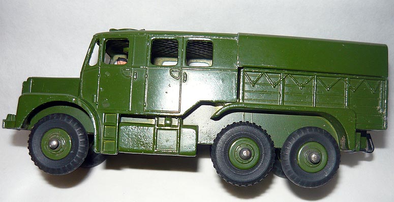 Bruce, Do you mean that some 689 have a smooth ceiling ? Jacques Forgive my ignorance, but my first 689 with a quality stamp of July 1957, three months before the model was released had a smooth interior roof. I noted this, but I sold it 12 years ago, and of course I had not worried about photographing its interior. Over the years I have had quite a number of 689s, and two with a quality stamp of October 1957 had smooth roofs. I have a mint and boxed 689 with the quality stamp of 56 1 AS, which I presume to be January 1965, although it has the traditional blue striped box with Supertoy hubs, so I do not think it could be January 1956 - anyway, this model has a cross-hatched interior. I just always assumed, (obviously incorrectly) that the smooth roof was normal! No wonder my first one sold for twice what I paid for it. A Dinky military collector, no longer living in Queensland, checked out my surplus stock and then had a look at some of those in my collection. I did not want to part with it as it was in excellent condition, but he made me an offer I could not refuse! I have another one lying around here somewhere, with one of those strange three row numbers, the last row being 057, so hopefully I can dig it out and check its roof. Cheers Bruce