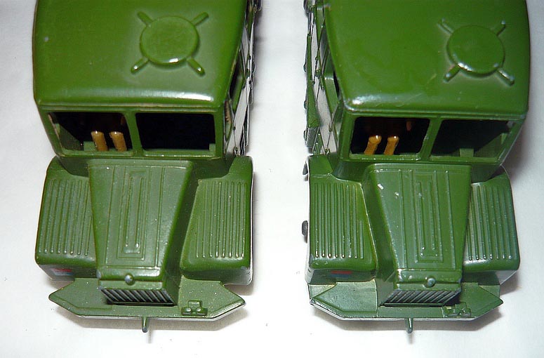 Having just picked up this 'thread' and being a collector of Military Dinky variations I thought that the DTCA had now set me on a search for the 689 with with the gap in the front bumper. I've now checked my three variants and it was a relief to find my very first purchase has the gap. Of interest it has metal wheels, a cross hatched cab roof interior and a Blue/White striped box imprinted 01 57. No need to panic at Sandown this coming Saturday! Malcolm