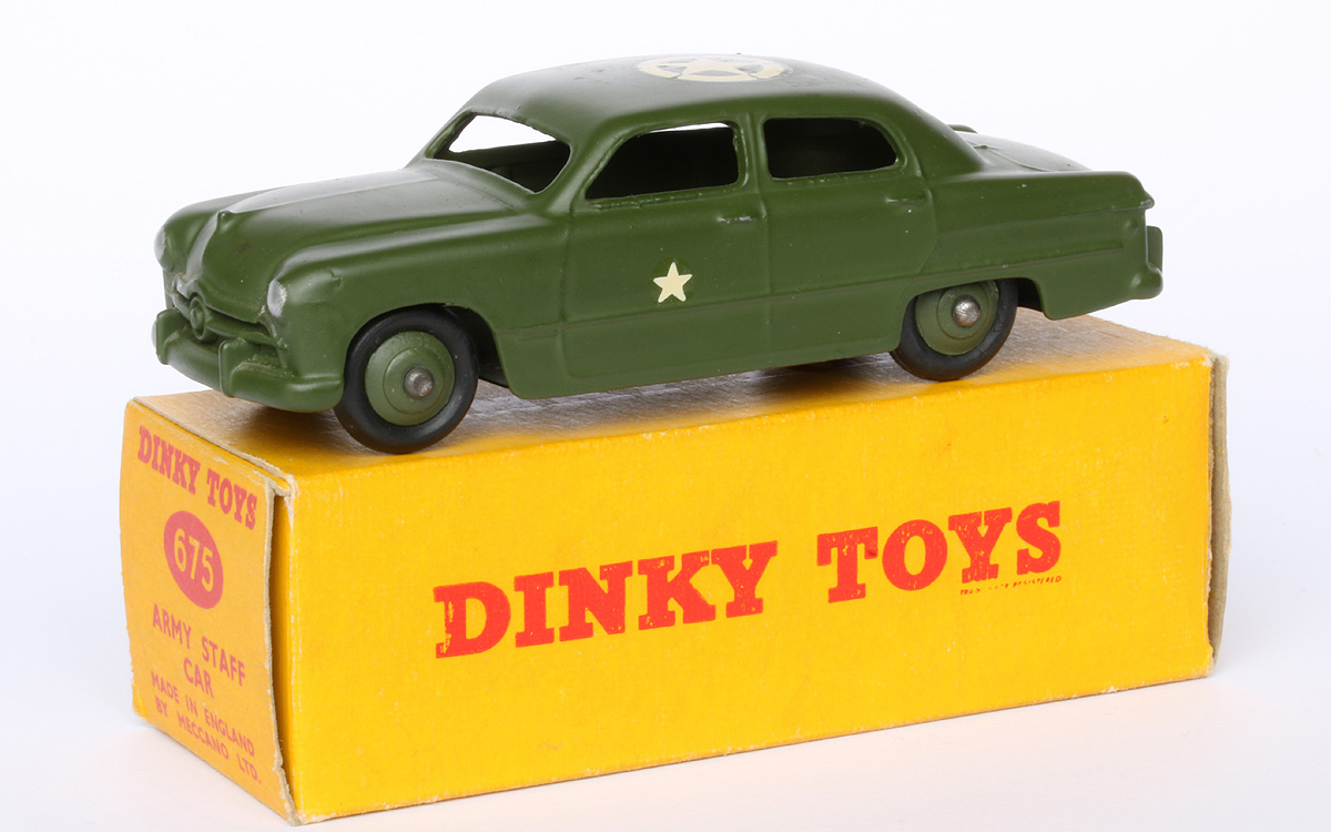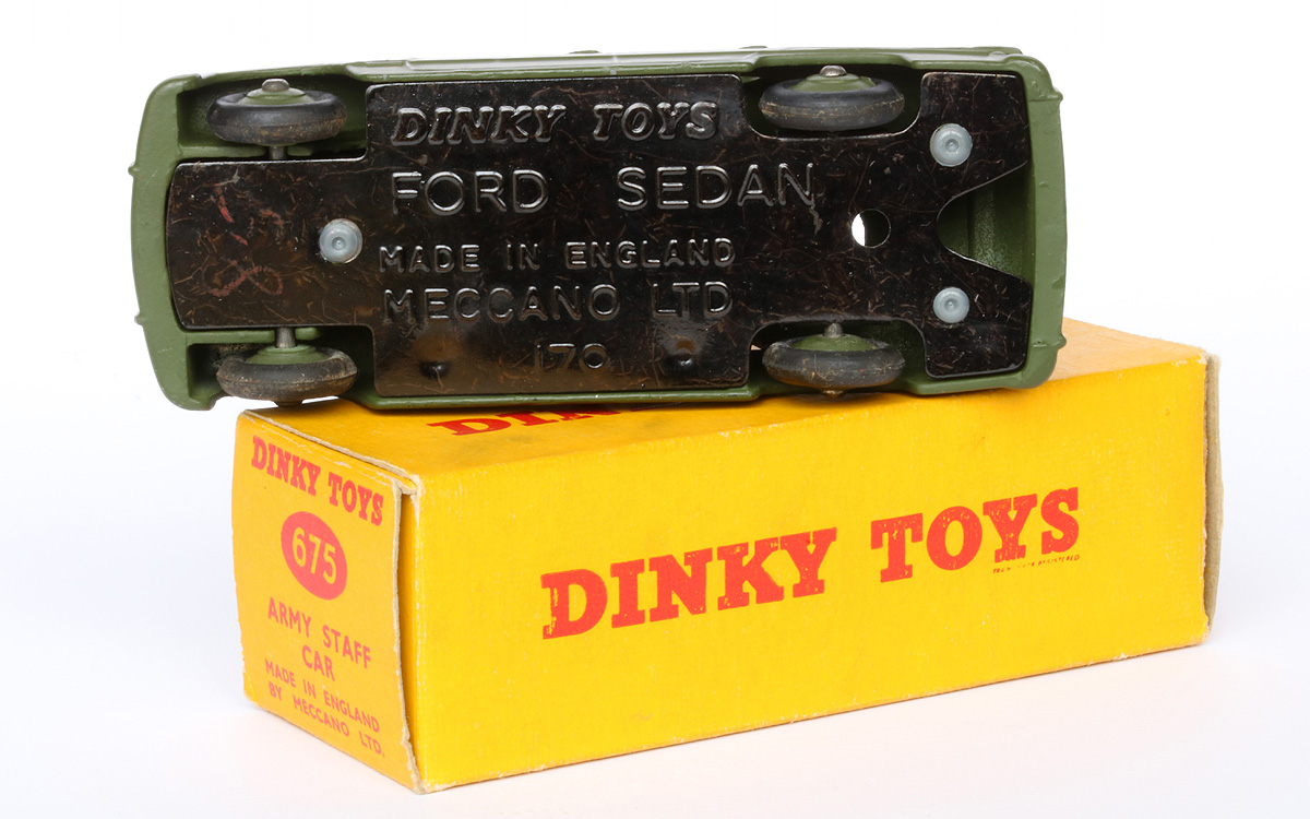 Just some comparative photos below, showing base plate and front axle supports differences. The later supports were shortened. The early base plate for 139am shows the ridges whereas the later 675 is flat with larger lettering + number 170, which is the later number for the civilian Ford Fordor, but remained there for the Military version too. No. 675 was sold in a plain yellow box with Dinky Toys brand name in red on all surfaces. The end flaps say: 'Army Staff Car'.