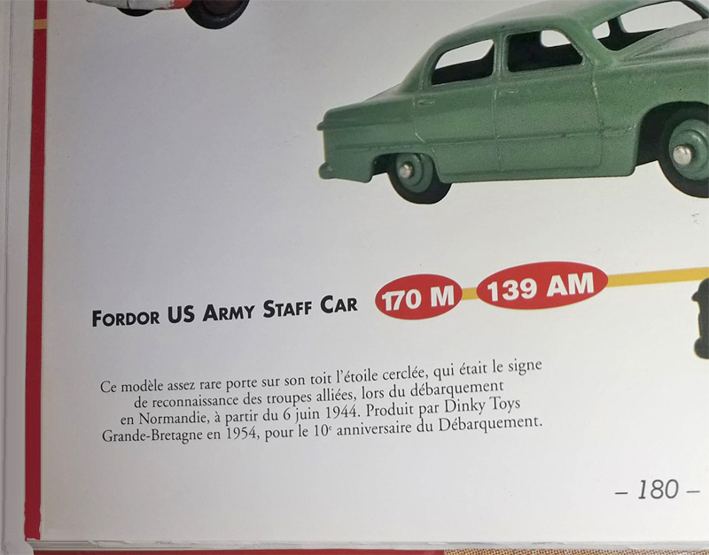 800 627Hello allI do not know whick book is on this photo but te writer certainly does not know what he is talking about. The translated text reads : 'this quite rare model carries on his roof the circled star which was the reconnaissance sign of the allied forces during the D day landing in Normandy from June 6, 1944. Made by Meccano Great Britain in 1954 for the 10th anniversary of the landing'Every word in this text is wrong including the title 'Fordor US Army Staff Car'. Meccano never wrote US but only 'Army Staff car' because there is a very rare version sold in Canada without the stars. This is the model in the book.This confirms the saying 'not everything written is true'.
