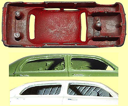Nice to see this new topic. This Ford Sedan is one of my favorites because of all the different colours issued and the army staff car with large lettering on the baseplate is the one in my collection. I compared them after reading the above post of Jan and can confirm that all my fordors with small lettering on the baseplate (left row) have the long axle supports and the ones with large lettering (right row) have the short axle support. All fordors with large lettering on the baseplate have the marking ford sedan on the inside of the ceiling. So does my army staff car.