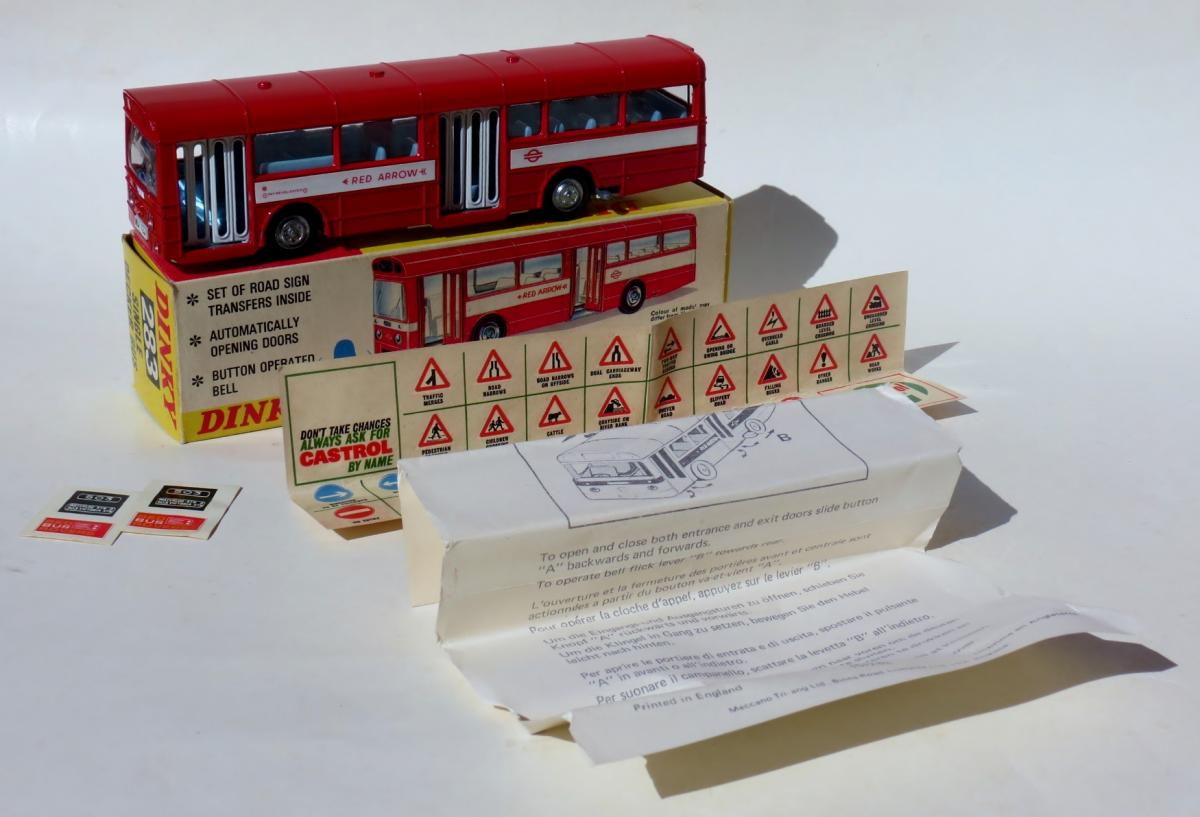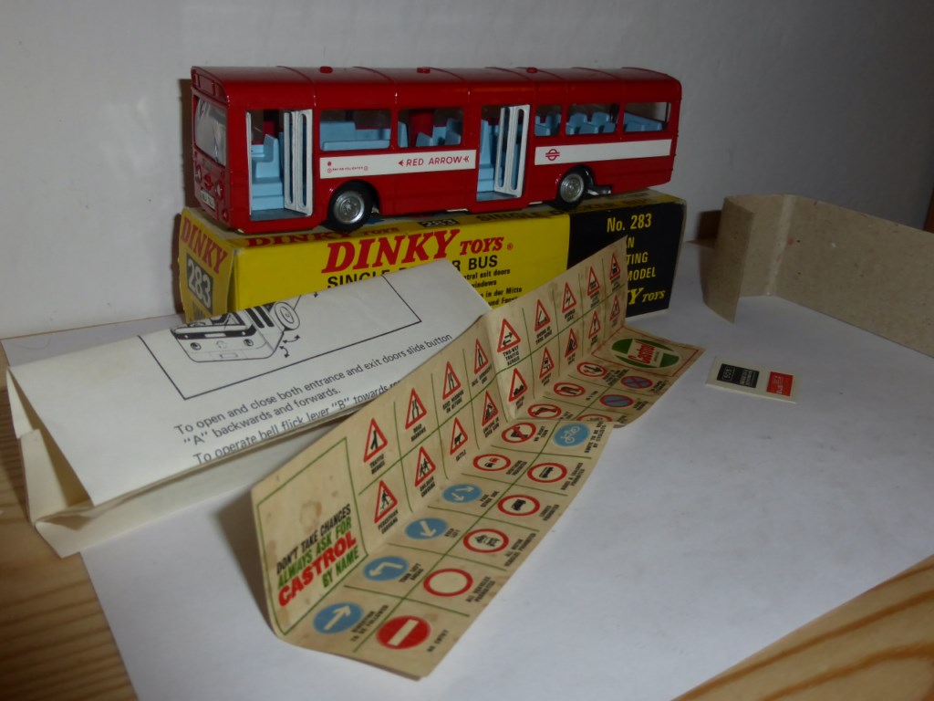 I am particularly happy with this latest addition to my collection, item #283 Single decker bus. In my opinion it is one of the nicest models of the Dinky production from the 70s - got this from a British collector. It should be the very first issue with cardboard box without label and it does come with a complete sheet of waterslide decals, unapplied adhesives, instructions and packing piece.