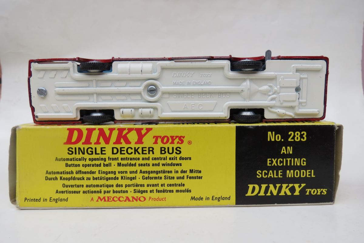David It is possible that the photograph in the June 1971 Meccano Magazine was that of the metallic red version which apparently was issued at the same time as the red non-metallic version. I was always under the impression that the metallic version came out later, but it is quite possible both colour reds were used at the same time as the box has the notation 'Colour of model may differ from illustration', with a similar wording also appearing on the back page advertisement in the June 1971 MM. The artist may have also used the metallic version for his catalogue artwork. Below are some photographs of my metallic version mentioned in my last Post that I have just located. It is interesting that the manufacturer AEC was not included on the box or any of the sales material but it was mentioned in the MM article as well as being engraved in the base plate! This is not the only Dinky Toys model where the manufacturer' name is not mentioned. It is also interesting that the title of the bus is SINGLE DECKER BUS on the box but the base plate refers to it as a SINGLE DECK BUS! Even the MM article cannot decide which to use, as the headline for the story of the 283 mentions SINGLE-DECK BUS (with a hyphen) and yet the story itself refers to the model being a SINGLE-DECKER BUS! It is difficult to date when your 283 went on sale, as on its release its retail price was1.19. which remained thus at least until February 1972, but by April 1972, the retail price had dropped to line-height: 21px; 1.17. By May 1974, the price had increased to line-height: 21px; 1.49 and by February 1975 it was again on the way up at 1.99, So it is possible, based on the trend at the time from its launch until April 1972, it is possible your model continued that trend from April 1972 until April 1974 when the price may have dropped to 1.15. Unfortunately, my metallic red version has no retail price written on it. Kind regards Bruce (150) 20160612/940/2330
