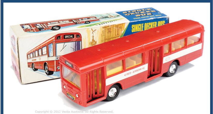 Thank you for your reply, Bruce. Your metallic exemplar is definitely a first series edition, so the two colour variations might well have been put into the market at the same time. I don't know why, but I, too, tended to consider the metallic red version as a later issue, maybe to please the kids with a fancier colour. I was probably wrong, then. And - at this point could someone shed some more light on the kit version of the bus (#1023)? I just know the basic facts but would be interested in knowing more. By the way, there's a Hong Kong plastic copy of the bus, often popping out from ebay and auction houses (see picture copied from the Vectis site).