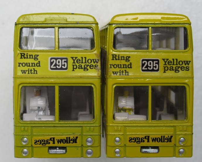 Richard -- thanks for the further details. Personally I have only the version with blue seats top and bottom, and the darker yellow version. (I understand from Jacques' Encyclopaedia that there are also numerous variants of the 'Kenning' Atlantean, but that livery has never appealed to me as much.) Perhaps it is a trick of the light, but can it be that on your bus with the white seats, the driver's face has actually been treated to some flesh-colored paint? If so, this is the only sample I have ever seen with that detail. Overall of course, this is a nice model despite the invidious Speedwheels, but it provides a good example of Binns Road cutting costs during the end by eliminating some painting steps. (Also, there is a related example of the factory saving money by re-using stickers on other models -- the #289 'Yellow Pages' Routemaster.)
