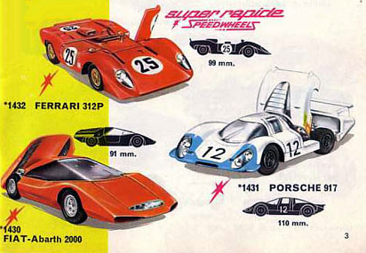 There are some examples where models have been published in catalogues and these models have never been issued. These are the Triumph Dolomite ref. 38 e, The Facelia ref. 519, the Simca 1000 Rallye II ref. 520, The Porsche 917 ref. 1431.