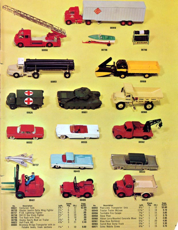Since I happened to locate these yesterday, here is a post regarding Gilbert's one-year distribution of Dinky Toys in the U.S. This is the last four pages of a 48-page booklet illustrating the company's 1963 product lines, which otherwise included Erector sets (not Meccano), chemistry sets, microscopes, and other homegrown toys. Since Gilbert was in financial trouble, the arrangement only lasted until 1964, at which time Lines Brothers took over U.S. distribution. I'm sorry the resolution isn't better, but given that these were full-page, it was a struggle to get each within the 800-pixel limit.