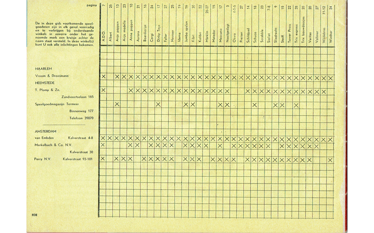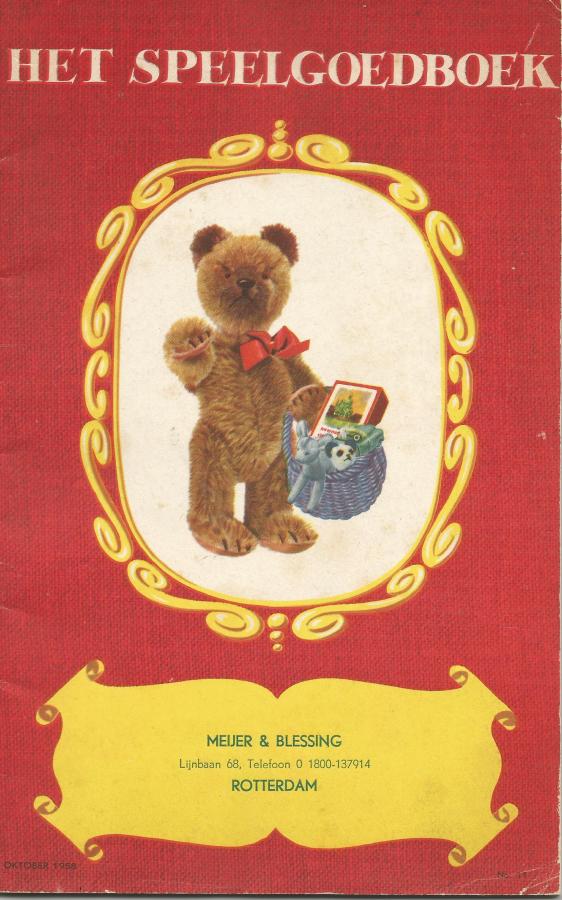 A nice little 32 page Dutch toy catalogue came along yesterday, including many toys available in Dutch toyshops in 1958. The issuing organisation is called 'Kwaliteits Speelgoed' and the title is 'Speelgoedgids' (= toy guide). Many brands, Dutch and from abroad, have disappeared since, Dinky Toys included, unfortunately. I'll reproduce some pages below, accompanied by some photos of items in my wooden toys and shipmodels collections. Subsequent to the title page and introduction there is a page dedicated to 'Nooitgedagt' wooden toys (c.1940-1970), a small collection of which I have. Dinky Toys are represented by a modest selection of the then current range, featuring the new no. 956 Turntable Fire Escape. Aurora plastic kits have one page too, including aircraft carrier USS Forrestal of 1957 (my example, from an older photoprint, with decals for USS Ranger). Many Aurora ships were to follow in the shipmodels collection. The back cover is very interesting, showing the availability of all toy brands listed, specified according to some well-known shops in the cities of Haarlem, adjacent Heemstede, and Amsterdam. Please, have a look at all the brands specified there! I have never seen such an availability list. The shops listed in Haarlem and Amsterdam were very familiar. None of them, however, have survived until the present day, very unfortunately. I have added one shop window photo - posted before - of the last one mentioned, Perry van der Kar. It seems that this catalogue is quite scarce, a little monument of toy history in the Netherlands.