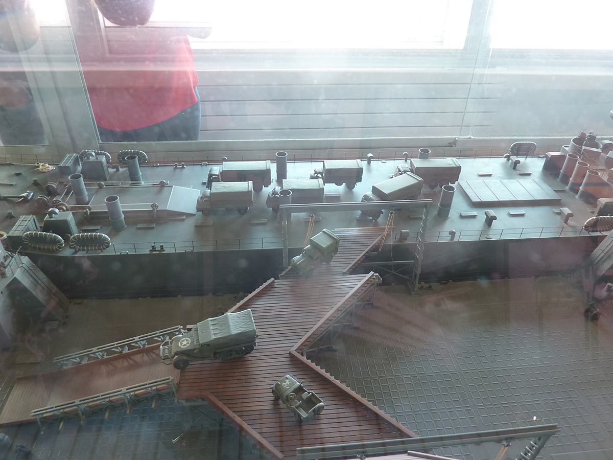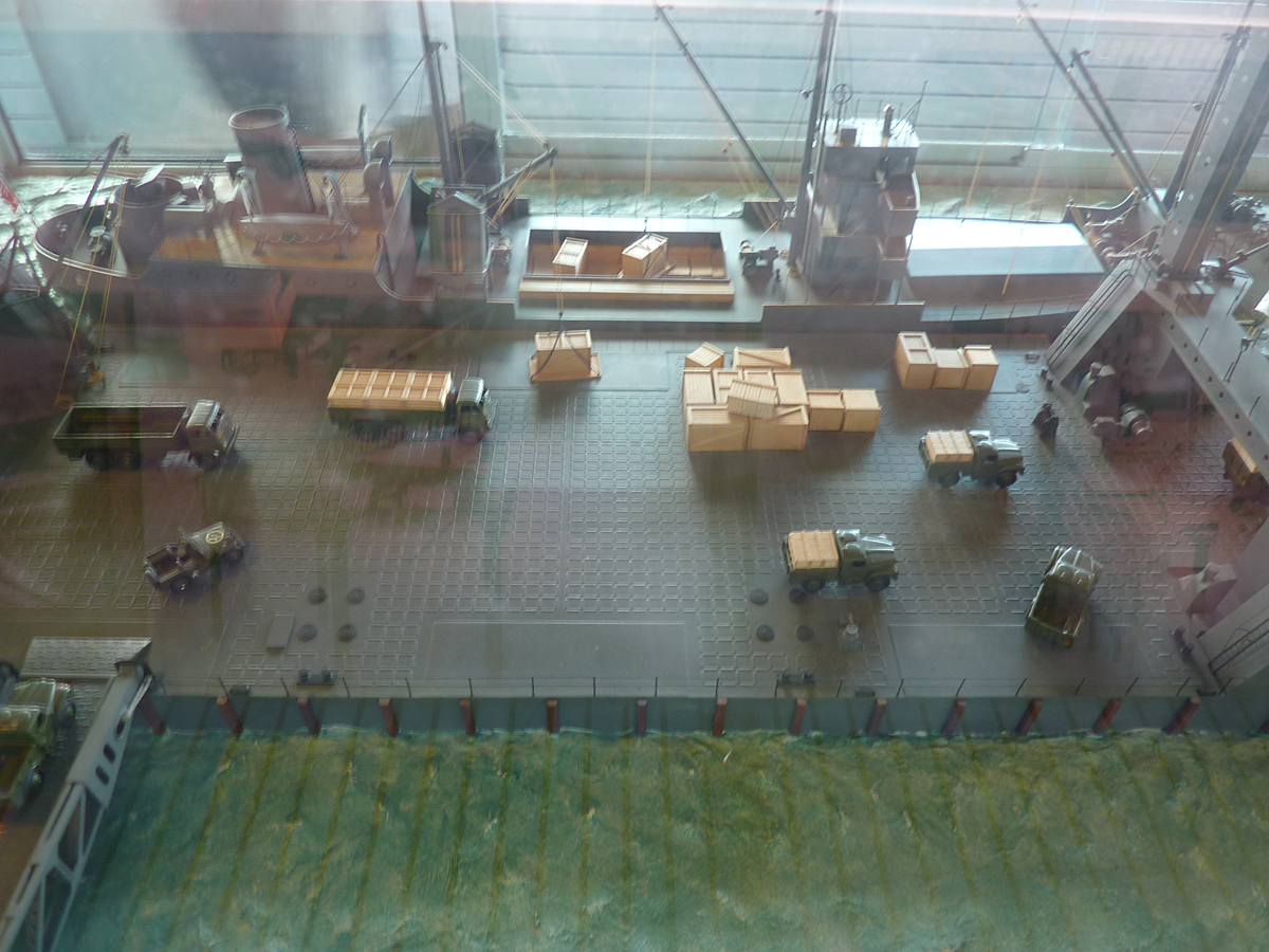 Two pictures taken at the Arromanches memoial museum. Arromanches is also known as Port Winston. It is the harbour that was build in England and floated to France a few days after D day. When in full operation, this harbour was the world first harbour in tonnage. It was used until the harbour of Antwerp had been taken back from the Germans.The model was made in England by Bassett and Lowke and offered to the museum. The Dinky Toys are what was available in the mid 50's. I am not a specialist in British military vehicle but I think that none of the real trucks in this model had been build before D day. This museum is well worth a visit although the light in it is very poor, please excuse the bad pictures. Photo Jacques Dujardin summer 2019.