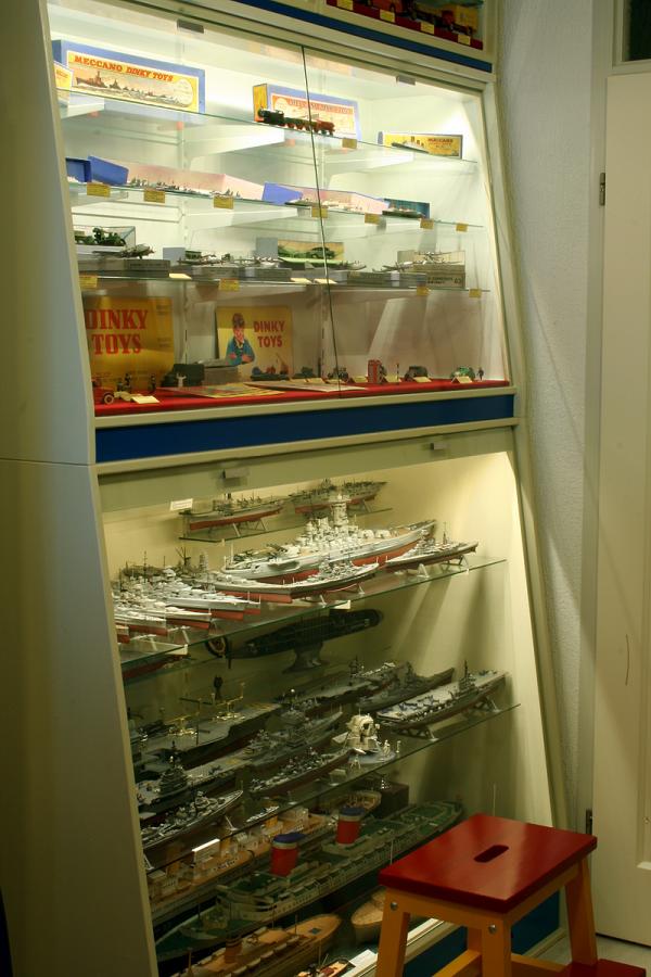 Hi all, some 1.5 months after conceiving a new additional display I managed to virtually complete it, slightly sooner than I had scheduled. But the whole project is not complete yet, the layout shown is provisional and makes part of an overall re-arrangement of the entire collection, because everything has started to move now. Moreover, the new display case itself will need some slight adjustments in order to function smoothly. And it will not be fully locked until half December, to be sure that all paint, kit, cement used is thoroughly, 100% dry and without any vapour accumulating inside the closed display unit. As this display, like the ships display below, is much deeper than the majority of my display units, I decided to include lighting. This LED lighting is without any heat and in practice I will only turn it on for a quick glimpse or at a special occasion in order to avoid any discoloration. Three deep shelves could be inserted and the base is covered with nice red velvet, similar to my other displays. As the angle of the displays front below is continued up to the ceiling displays I did not need to construct complicated and less dust proof glass doors. The glass plates just rest in that angle and are supported by the base. Less than half a millimeter is the seam in between, much better dust proof than average sliding or hinged doors. I have even made some small holes in the back for allowing some minimal ventilation. It did require some very accurate working indeed to have everything perfectly square. Starting the operation it was just the need for space in general, I had no specific idea of what items would be on display there. In the course of the work I had the time to think about that and it turned out that it could easily accommodate my modest size pre-war Dinky collection, mainly ships, aeroplanes and some gift sets, which deserve a nicer way of displaying. Having extracted them from my existing displays they left a lot of space there, allowing to have a far more spacious line-up of the rest of the collection. Now I have started the re-arranging of the contents of these. I presume that everything will be settled definitively early December. Kind regards, Jan