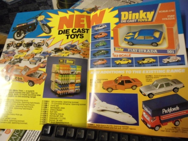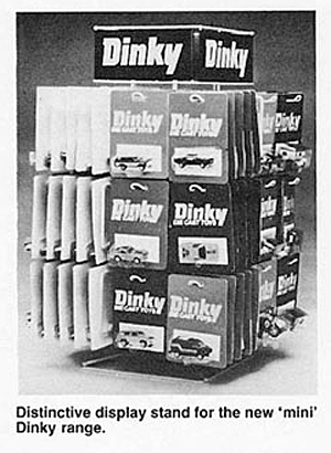 This display was produced by Airfix after the closure of Binns Road and was designed specifically for the small-scale models they imported from Hong Kong (nothing to do with the earlier Mini Dinkys) and sold in 1980. These models were sold in blister packs that hung from the pegs on the display. A relic of a sad time in Dinky history, alas!