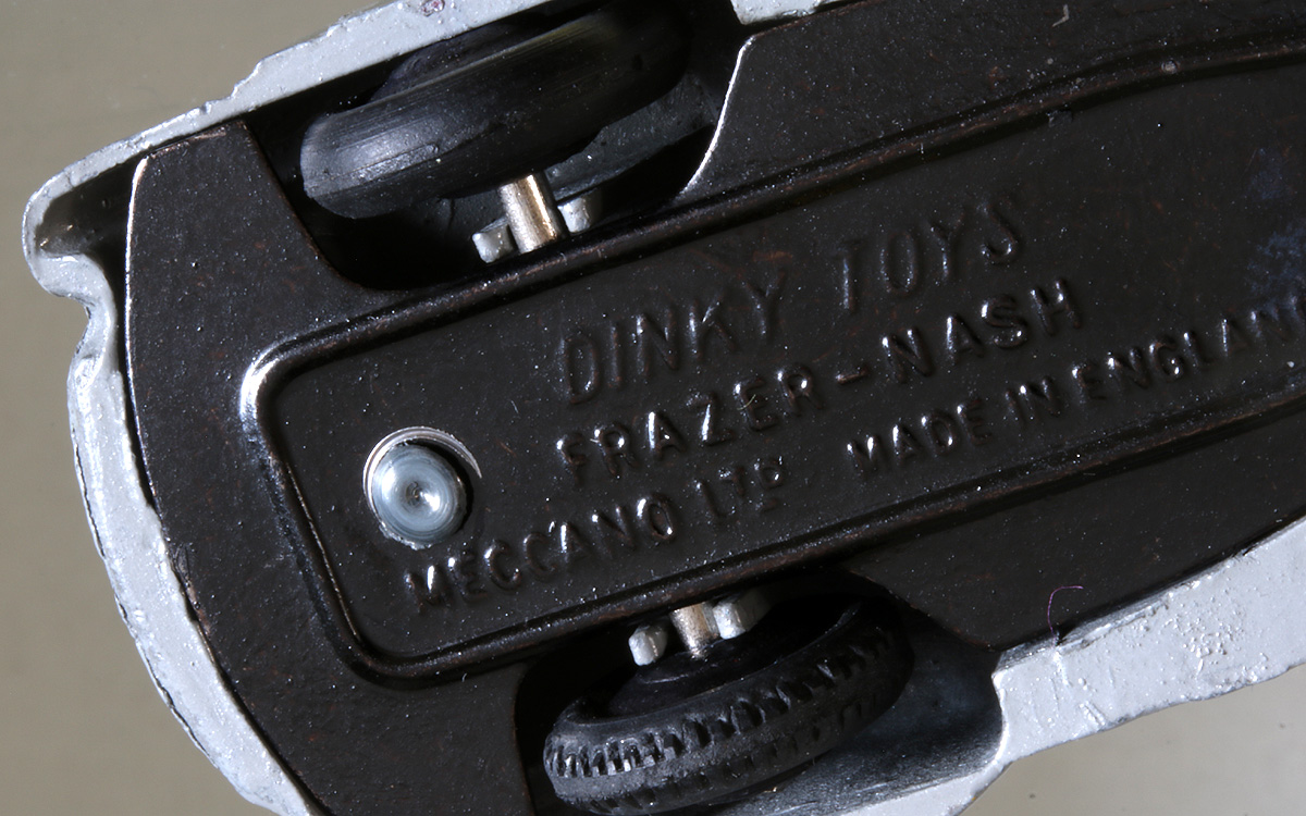 Sometimes different kinds of tyres can be found on one model. This may be due to incorrect replacement of tyres. In the case below, the rear wheels and tyres of a Frazer Nash, this is not possible, because the tyres cannot be replaced without visible traces of the replacement. This is an obvious factory error, in the years that both types of tyres were in use in the factory, in this case ca. 1946-1947.