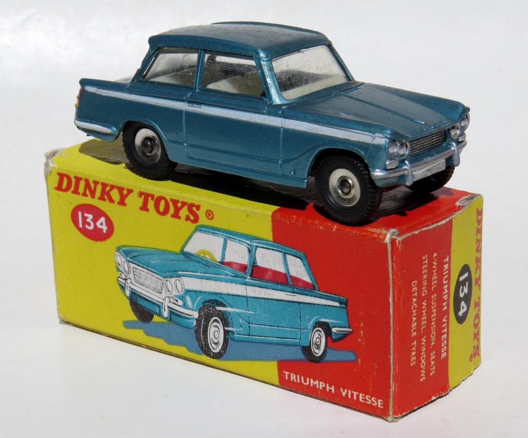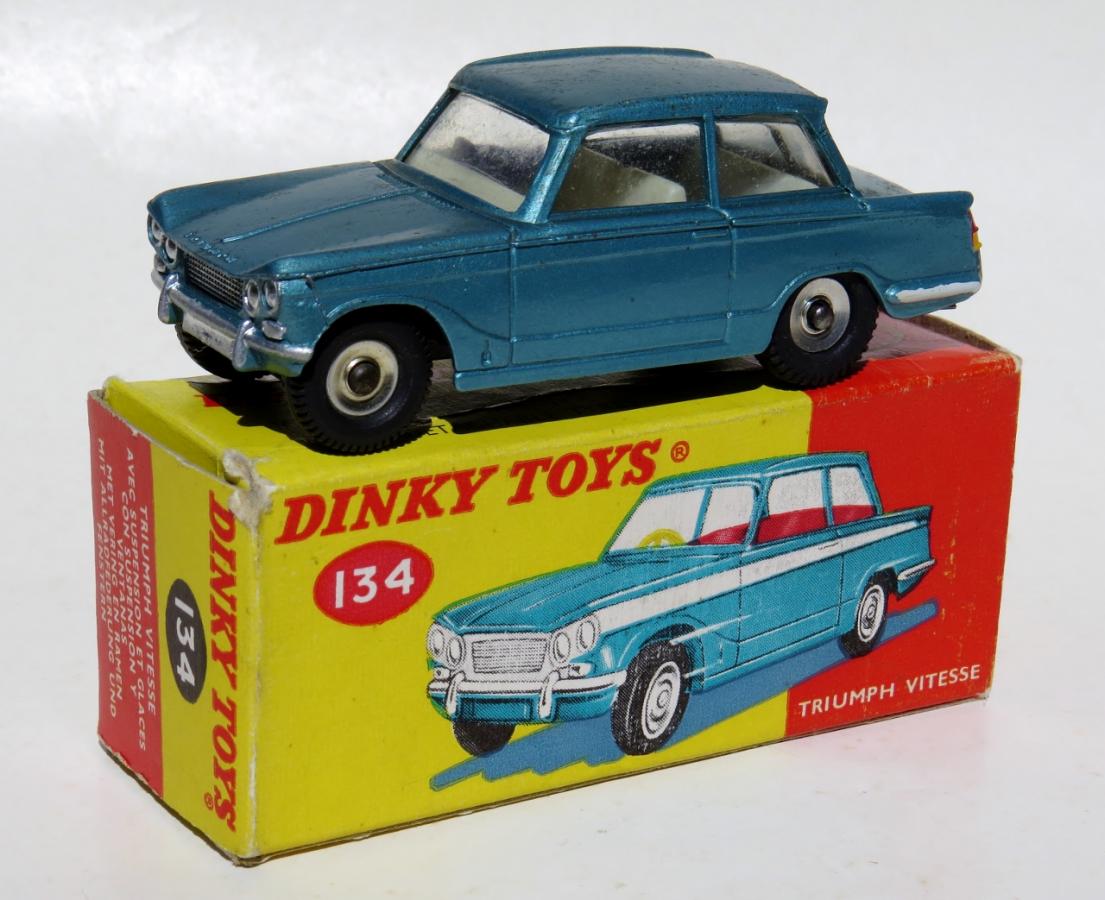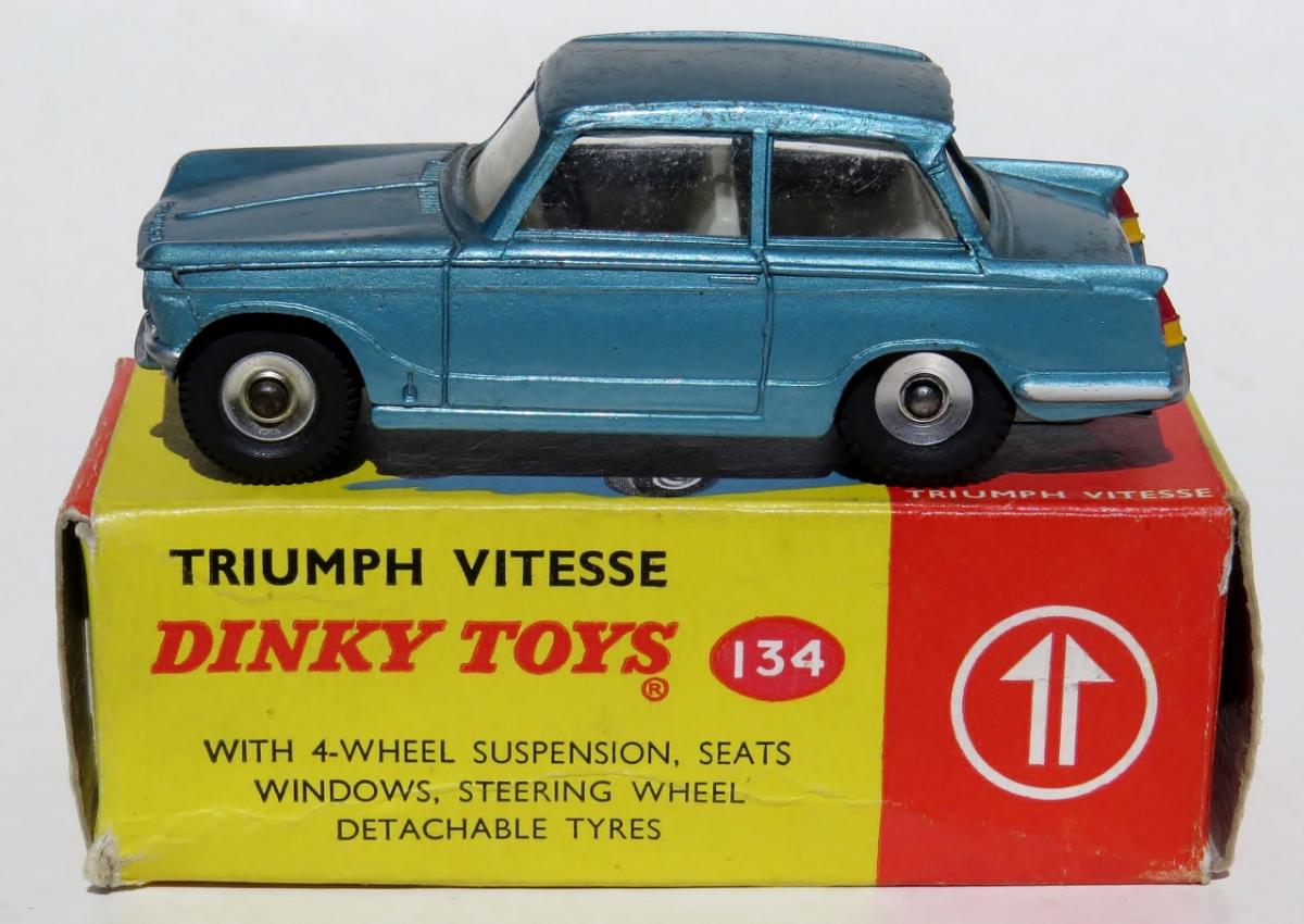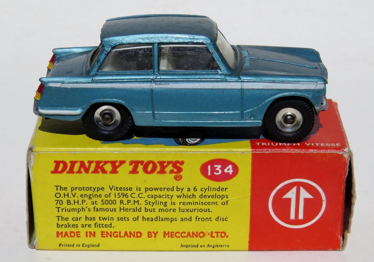 Greetings all! I saw that this Topic has been rather quiet lately with the last entry having been made on 6 July 2015 by Richard. In answer to Richard's Post, I too have noticed the occasional differences with large hubs, not forgetting a mix of plastic and grooved metal hubs. My effort this time is a 134 Triumph Vitesse, originally part of the collection of the well-known Dinky Toys collector and writer for Model Collector magazine, John Kinchen. The person responsible in the factory for spraying the side flash forgot to turn the model around and do the left side! I guess someone was too busy catching up on the latest goss! Here is the driver's side, all correct,