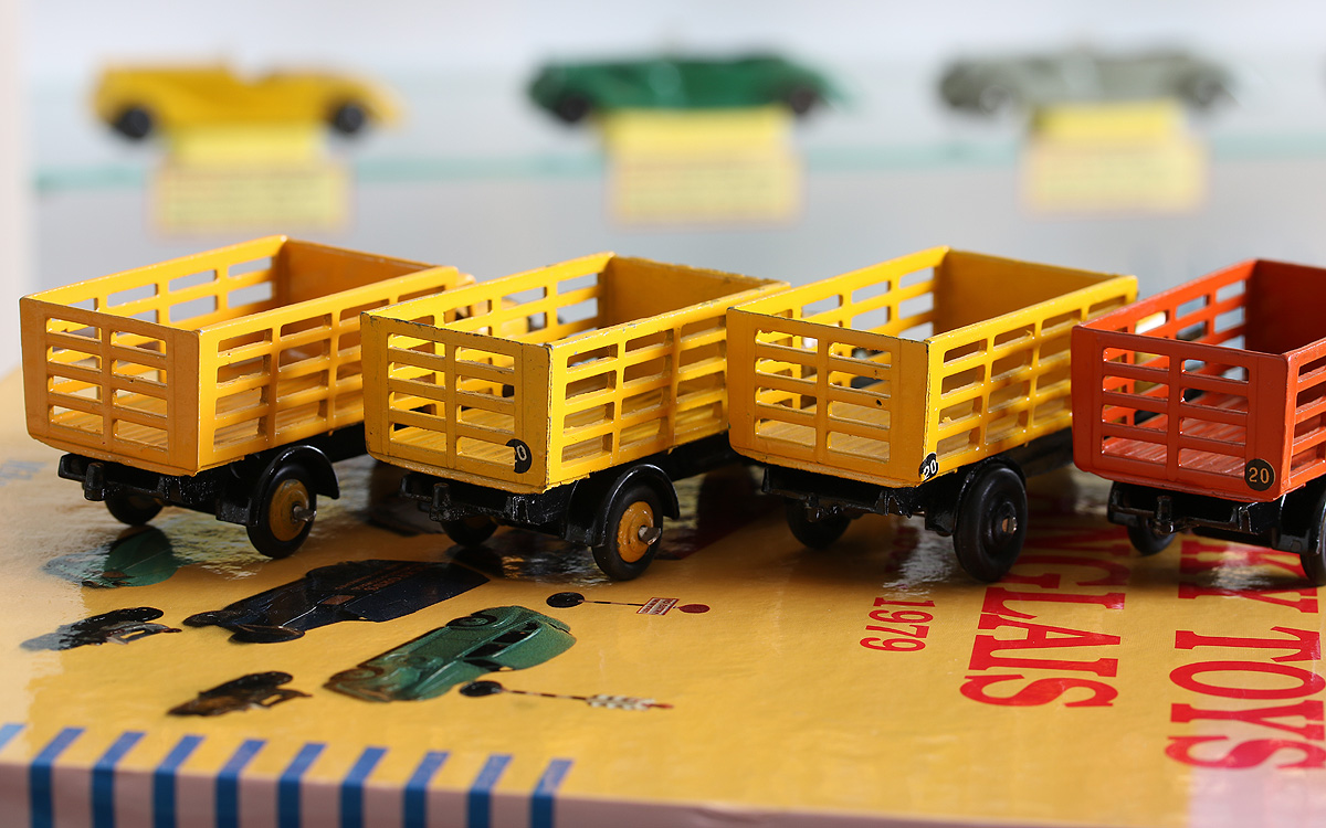 Three yellow Market Gardener's Wagons, all of them showing anomalies in the '20' roundel decal's positions. The first one on the left bears no decal at all, as it was probably meant for export. The second shows it partly pasted over the grid, resulting in the brittle film breaking off there. The third one has the transfer pasted 'around the corner', on the side of the body. The orange one on the right is the only one with the decal positioned as it was meant to be.