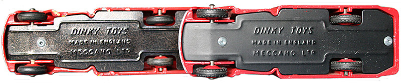 The best thing to do when you do not know the answer to a technical question is to ask a specialist. So yesterday, I packed some Dinky and drove 10 miles away to an electro plating compagny. The technical manager is a very nice guy whom I have met before. He took me to the lab and tested some dinky with some electronic analyser. This confirmed what I knew that the gloss base plates are painted with electrostatic powder paint. The analyser shows the thickness of the coating. The finish of the base plates of models similar to Jan's picture above does not have a thickness, there is no coating. In French, this finish is known as 'brunissage' and is an oxydation of the metal done in a solution of soda and some additives at 140 c. This treatment can give both finishes as on Jan's picture depending on the temperature, time in the solution, concentration of the solution, drying etc... This finish is not an electro plating. Google and Wikipaedia do not return anything for 'bruno finish' or 'brunofix'.