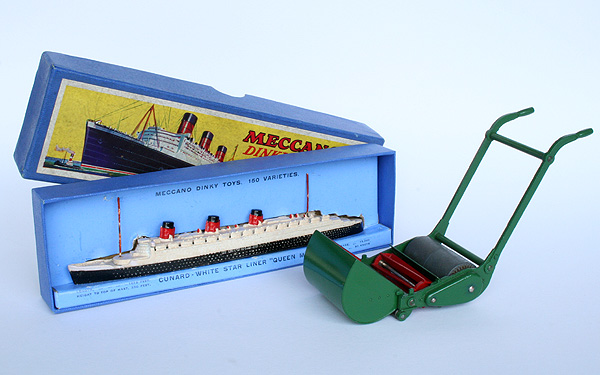 Extreme Dinky scales together: the Queen Mary (and all other pre-war ships) on 1:1800, the Lawn Mower on 1:8!