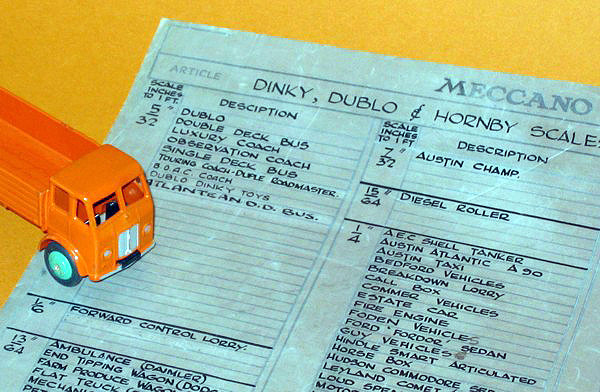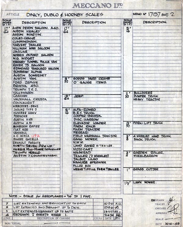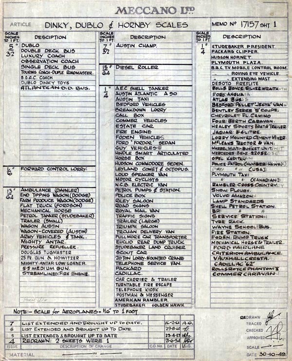 The well-known Memo no. 17157 Dinky, Dublo & Hornby scales sheet 1 of 30-10-1949 and brought up to date until 16-2-1961.