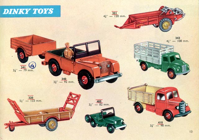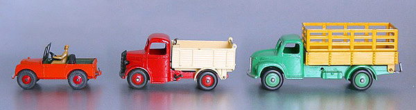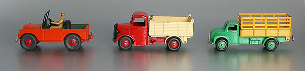Three Dinky models on similar size, the Land Rover, Tipping Wagon and Farm Produce wagon.
