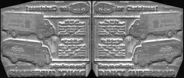 It features the 923 Big Bedford Heinz and the 918 Guy Van Ever Ready and is from Christmas 1955 when both these models were introduced.The image on the left is the actual scan and everything is reversed. The image on the right is flipped in Photoshop which makes it easier to read.I am going to try to get an impression on paper but this may take a week or so.These blocks are really rare as they are made from lead and after the featured models were discontinued and they were no longer required they were returned to the block manufacturer, melted down, and made into a completely different block.I managed to acquire three of these during the last 25-30 years, I only remember seeing about 5 or 6 others over this period.I will show the others later.Dave