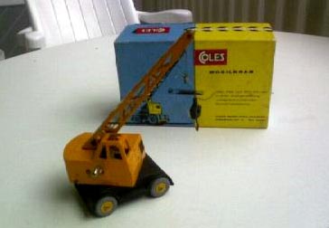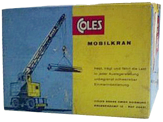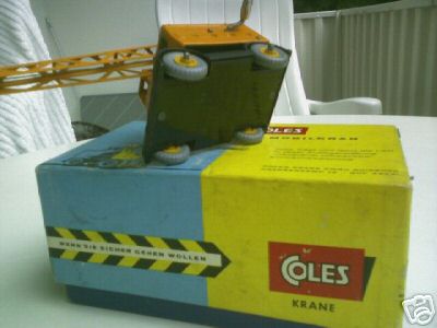 Rob, That is a very rare item but the rarest is probably the promotionnal issue for the Coles agent in Germany. Very little is known about this variation. The box is specific and the model is probably the latest one with unpainted jib. Who has one ? The lifting hook on this late version is either diecast in one piece or plastic. Are the olives on the crank steel or plastic ? Your model seem to have the late plastic lifting hook but some of these cranes were fitted with the solid one piece diecast hook.' Jacques The Coles German promotional is normal in every way including the jib. Bruce